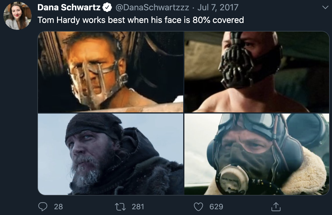 「因為湯姆哈迪實在是太帥了,以至於他在每部電影裡都需要將他的臉遮住,以防觀眾忍不住親他。」