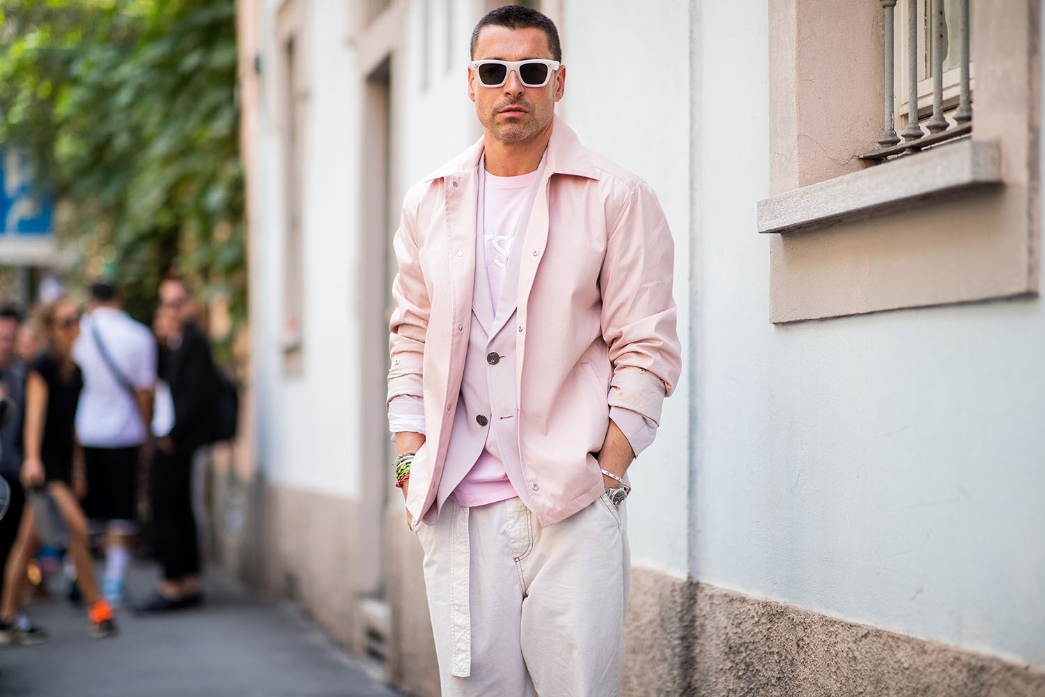 《WWD》時尚總監Alex Badia在2019米蘭男裝周穿著粉紅色外套。
