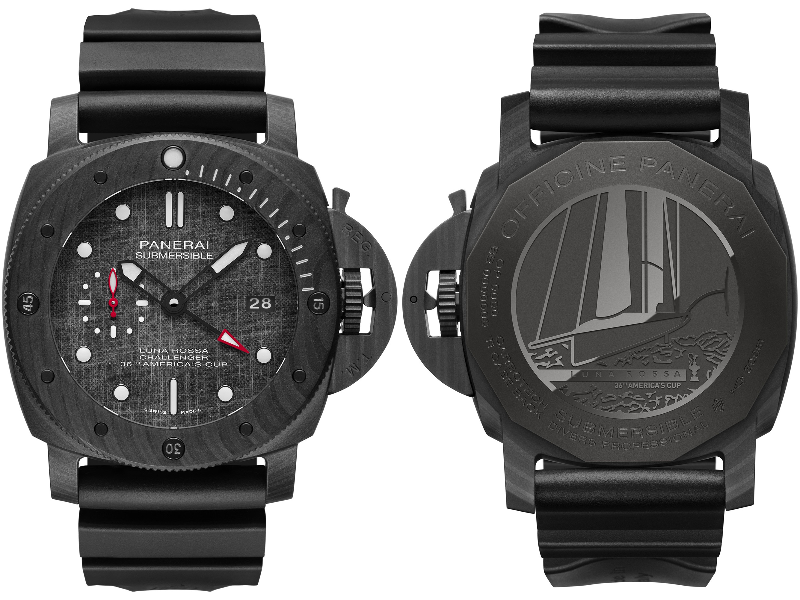 除此之外,沛納海宣佈成為義大利帆船隊Luna Rossa的官方贊助品牌,該支船隊是第36屆美洲盃帆船賽的紀錄挑戰者,並且向這個當代歷史最悠久的運動賽事所應用的科技和素材擷取靈感,打造一系列腕錶。「Submersible Luna Rossa專業潛水腕錶」正式此次異業結盟的首個成果發表。這枚專業潛水腕錶,呼應船隊AC75賽船的碳纖維船身,同樣採用碳纖維鑄造錶殼,錶盤更鑲嵌船隊的船帆,防水深度達300m。Submersible Luna Rossa錶殼採用Carbotech鑄造,此嶄新物料由沛納海率先引入高級製錶界,以碳纖維為基礎成分,質感輕盈,可抵禦外來衝擊和防止磨蝕,而AC75單體帆船的船身,同樣採用碳纖維物料製造,其圖像鐫刻於腕錶的鈦金屬錶背上,與Luna Rossa標誌和「America's Cup」字樣相映成趣。