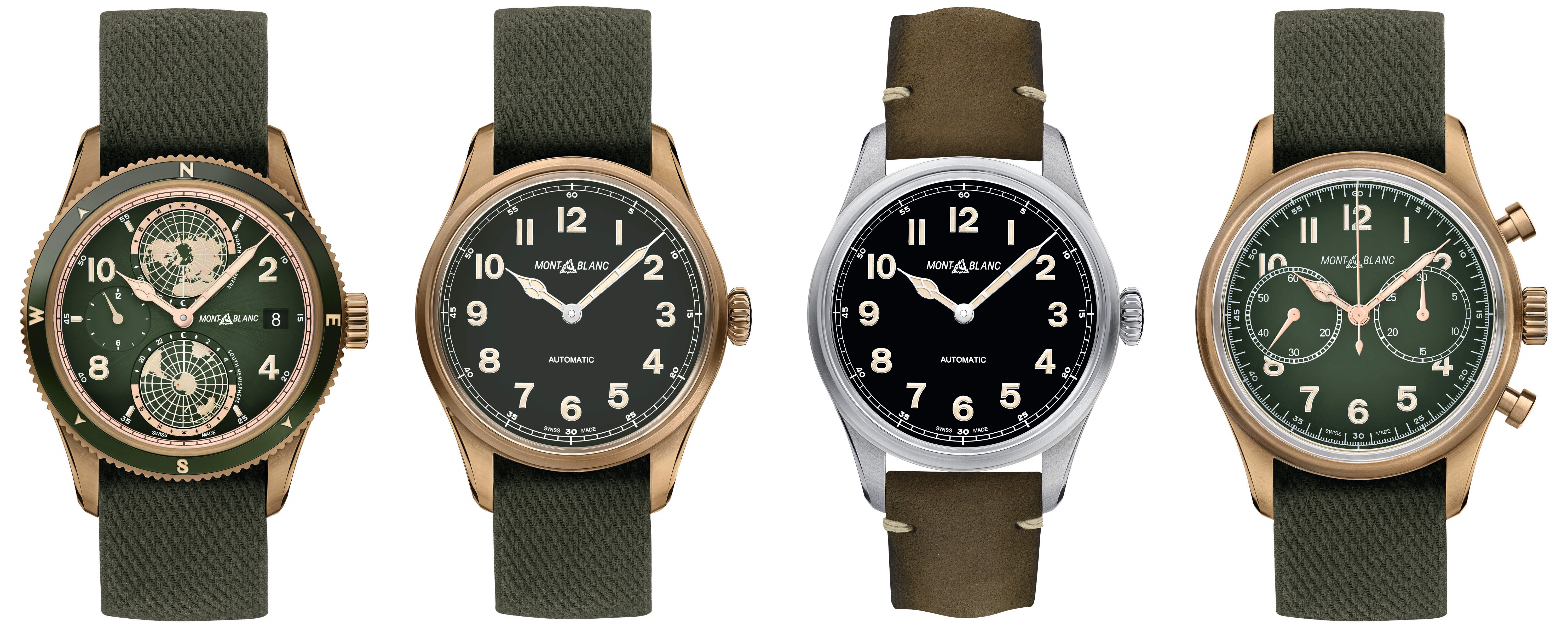 左起萬寶龍1858系列Geosphere腕錶限量款1858、1858系列自動腕錶、1858系列自動腕錶、1858系列自動計時碼錶限量款1858