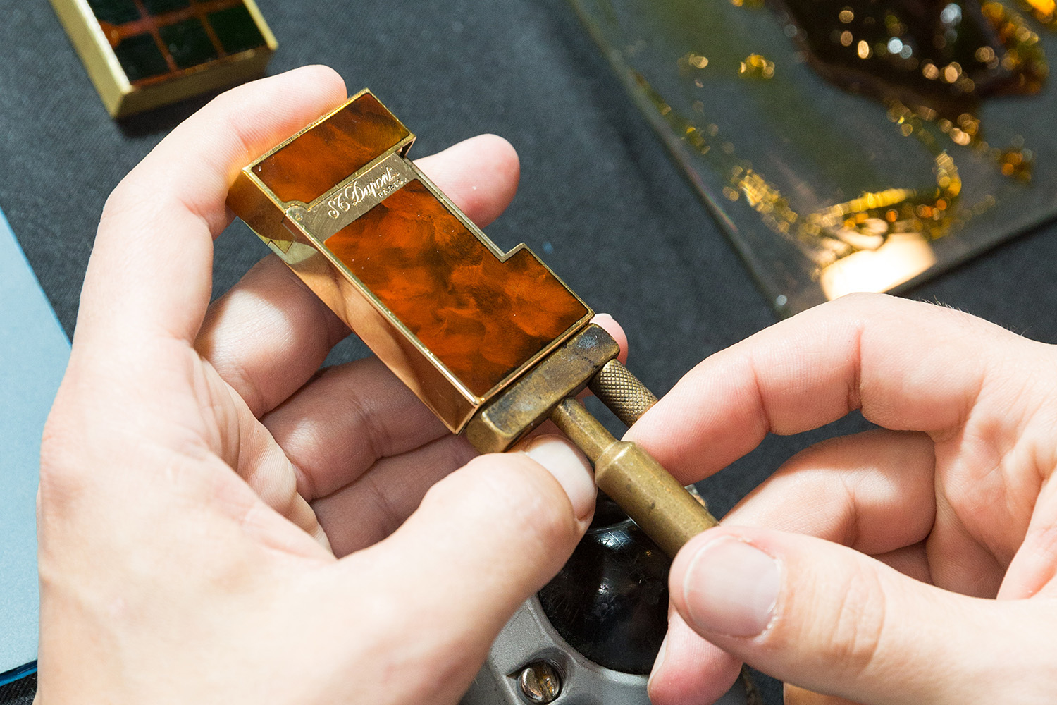 值得慶幸的是,百年老牌「都彭」 的打火機和筆具,始終堅守中國漆的傳統,一直傳承下去,不但樹立了品牌獨一無二的風格,也讓兩千多年古老文化得以延續。中國漆有一種異國風情的神祕,而大都伴隨著皇室王族的血統更使得這項工藝成就了高級訂製的稀有性和收藏價值。Yoann拿起人髮製成的毛刷一面示範,第一道半透明的生漆塗裝的動作,一面解釋,每一件中國漆藝品要視表面材質和漆色形成,一道一道仔細勻稱塗刷的層次,從最基本的六層,甚至到二十層;更辛苦的是,每道漆都要憑師傅經驗,用烤或自然乾燥讓其成形,最後一道,甚至要等上三個足天。尤其在那麼小的筆身或打火機身上施以金粉或碎蛋殼為裝飾圖案,要兼顧精緻和成品的平滑光亮,其費神程度,可想而知。中國漆藝之美絕非一般合成漆料成品所能堪比。也因此,「都彭」 獨步業界的中國漆精品製成祕方,只有兩個關鍵人知道。