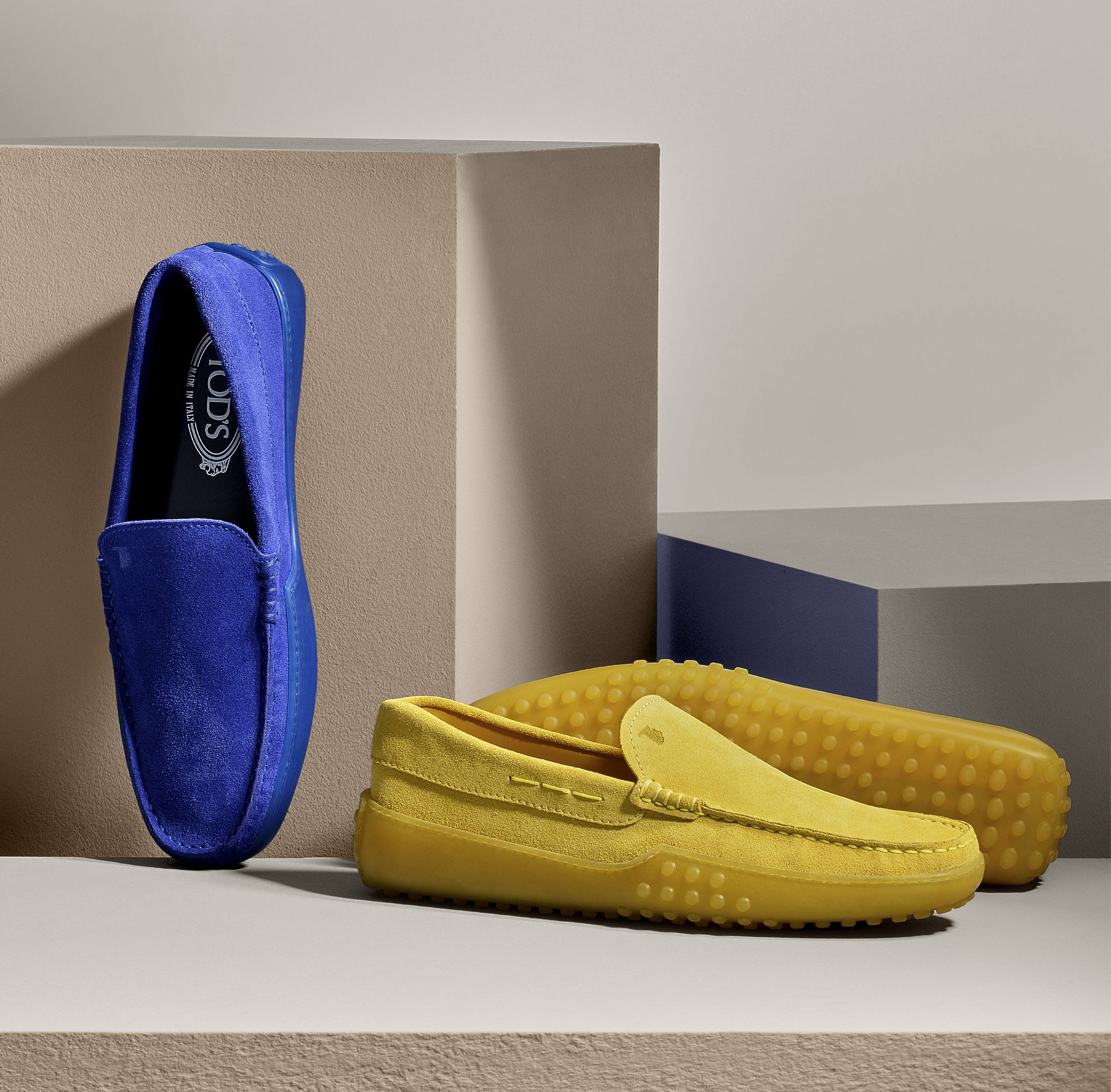 豆豆膠底鞋_$20,600 by TOD'S(左:麂皮藍色;右:麂皮亮黃色)。