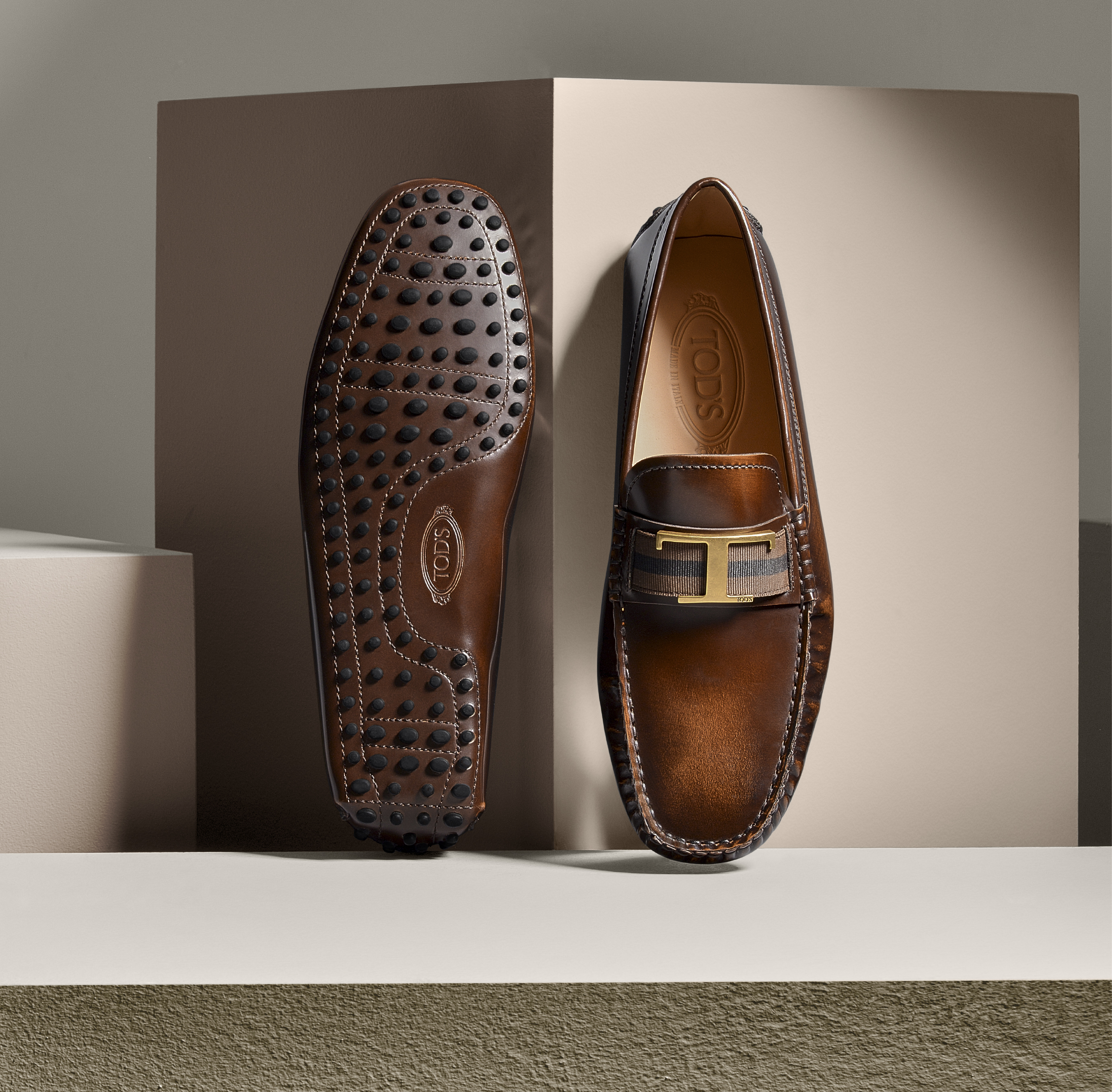 延續獨到的皮革經典工藝技術,秉持自然原貌為原則,運用頂級皮革材質傳遞不張揚的優雅氣度。在經典設計的基礎上昇華,以全新T字金屬飾釦與暈染色調揮灑在鞋款上,進行多種排列組合;鞋底品牌標誌性橡膠豆豆,呼應經典的同時也增添實用性。