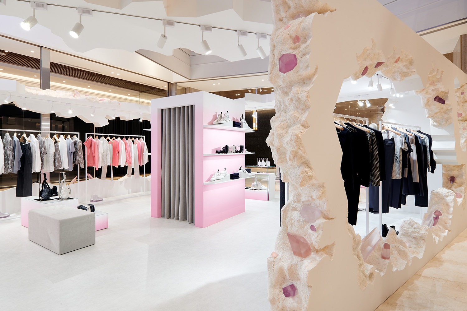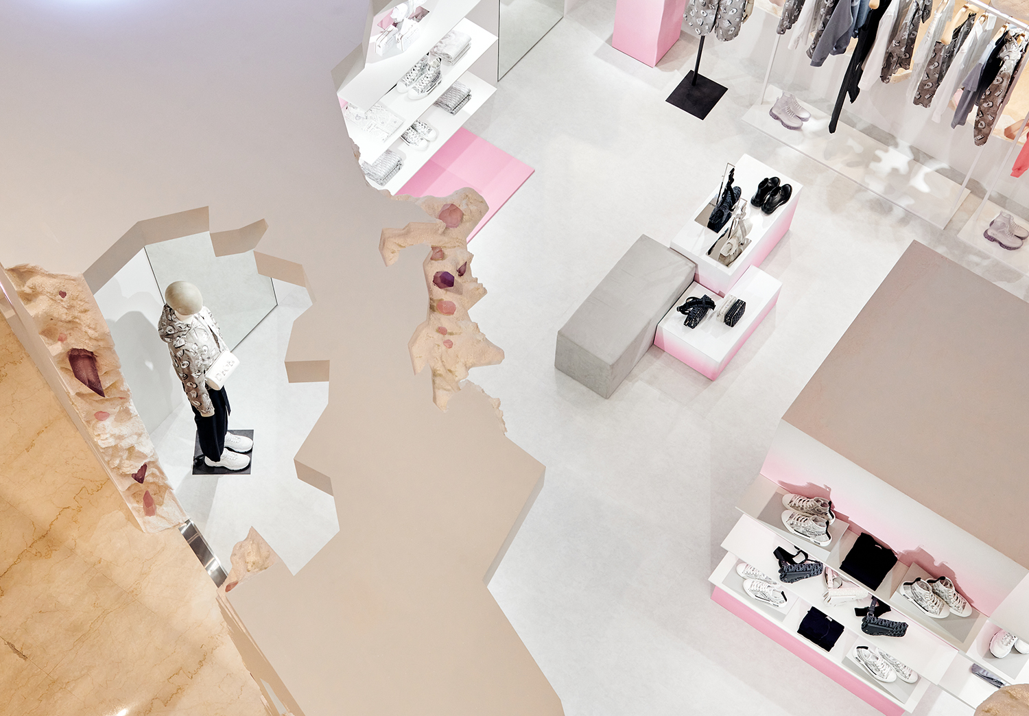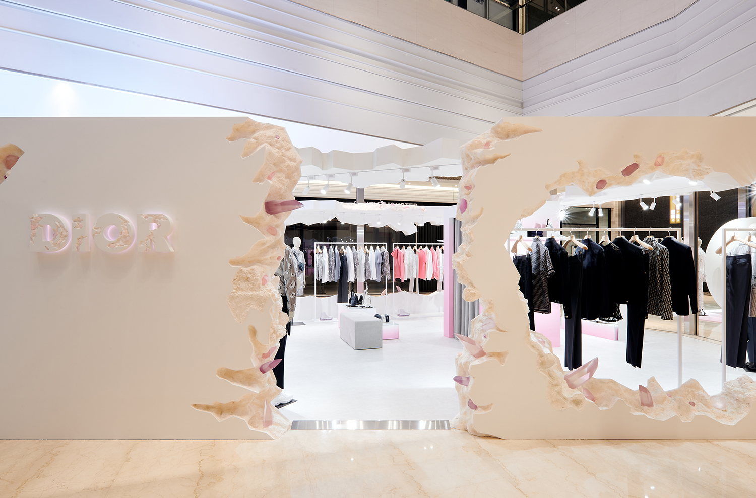 即便是期間限定,但整間概念店絲毫不馬虎,店櫃空間比照該季秀場打造,符合春夏時節的粉亮色系與腐蝕風化造景吸睛又搶眼,強調「未來遺跡」主題。門前巨大醒目的CD字母裝置藝術必會造成新一波打卡聖地,白色與粉紅漸層的地板和牆面呼應秀場中隨著模特兒腳步漸變的沙地狀態,牆面則點綴著由攝影大師 Steven Meisel 掌鏡的全新 2020 年夏季男裝形象照。