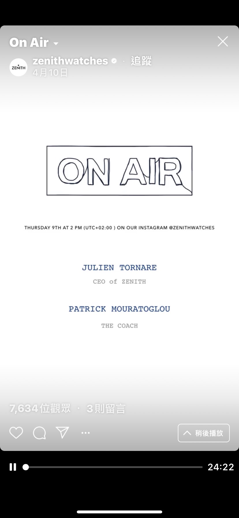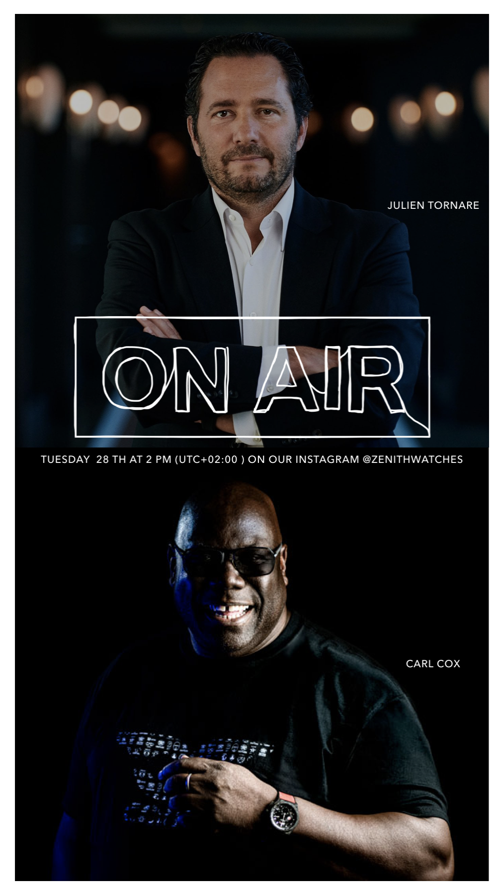 這次的對談將於台灣時間4月28日(二)晚間8:00準時上線,並透過 Zenith的Instagram官方帳號發布,只要搜尋:「@ZENITHWATCHES」鎖定他們的IG TV頻道,就能第一時間在直播節目上,與傳奇DJ、品牌CEO一同暢聊音樂與生活。