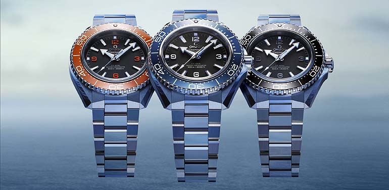 配戴的就是這支極美的1858系列Geosphere冰川藍面腕錶。