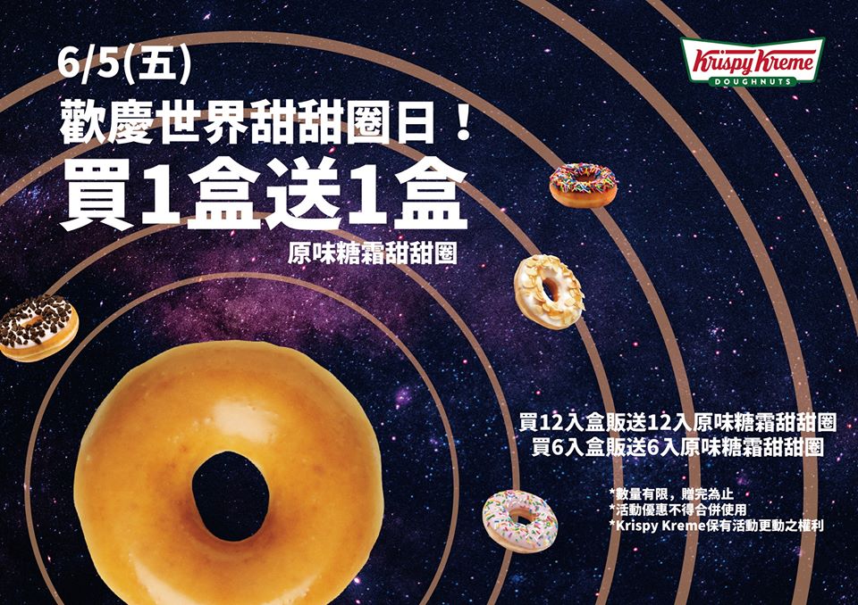 每年6月的第一個禮拜五,是美國的甜甜圈日,是為紀念在戰爭時,做甜甜圈給軍人的婦女而設立。美國來的品牌當然推出慶祝活動,到店購買6入或12入盒裝甜甜圈,就送同樣數量的經典原味糖霜甜甜圈。提醒您:外送沒有優惠,請自己跑一趟吧。