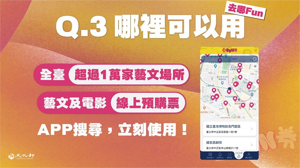 由於這次疫情中,電影院沒人看,藝術表演全面停擺,且因國際書展停辦,出版業營收也萎縮。文化部推出600元的「藝Fun券」,僅限使用於購買書籍、藝文票券或電影院票券。不過並非人人都有,文化部提供20萬份,透過登錄抽選,有中籤才有,僅限數位券。相信對各位熱愛藝文、隨時要帶本書在捷運上閱讀的君子、淑女們,這600元藝Fun券非常重要!
