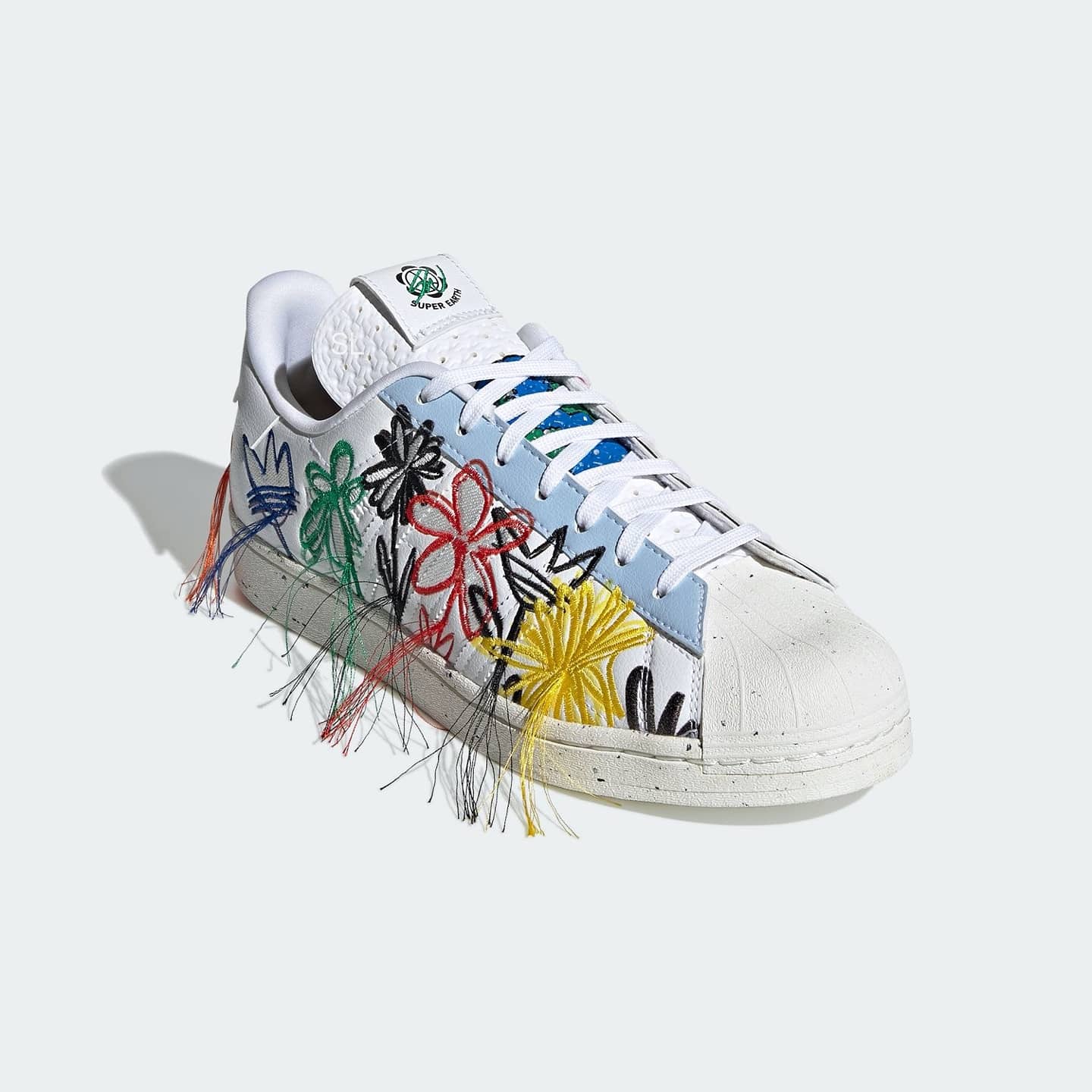 透過這次釋出的圖片可看出,以經典SUPERSTAR為主體,鞋身加上刺繡小花,adidas LOGO放在鞋身富有民族風,也略微童趣。鞋後跟的地方,分別寫上adidas以及SUPEREARTH,鞋舌則有鞋款名稱SUPEREARTH。鞋底為軟木塞風。
