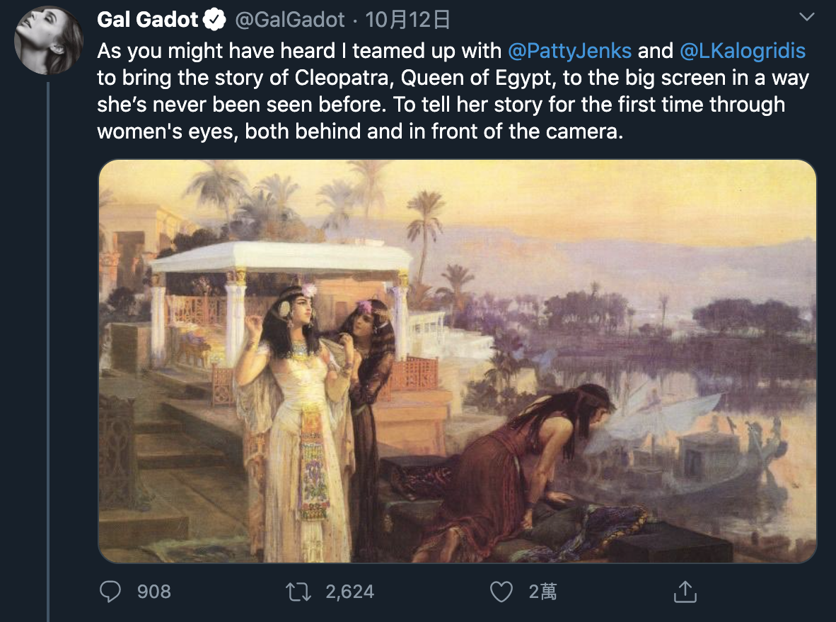 也因為有過去的歷史,派拉蒙影業其實不只一次進行改編,更有傳說考慮過由詹姆斯卡麥隆、大衛芬奇,或是近年火熱的《銀翼殺手2049》導演丹尼維勒納夫來執導。據傳本片也讓安潔莉納裘莉(Angelina Jolie)、女神卡卡(Lady Gaga)相當感興趣,但現在讓蓋兒捷足先登,看來積極籌劃已久。她也開心地在官方Twitter上宣布這次的計畫,表示將以前所未有的方式將「埃及豔后」克麗奧佩托拉的故事再次搬上大螢幕,這也是第一次透過女性視角來講述她的故事。看起來相當令人期待。