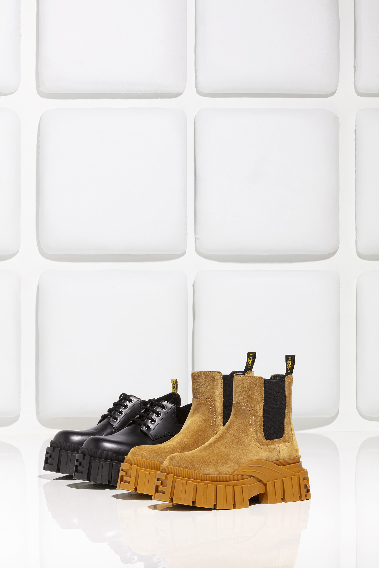 SVF:主要分成兩類:高底的鞋靴與運動鞋。我喜歡高底鞋或者是鞋底很平的鞋,當你用它來搭配西裝或大衣時,會帶來不一樣的態度,只要換一雙鞋就會變得完全不一樣。鞋子是當前時尚圈的重點項目。穿上份量感十足的高底靴時,會覺得自己是個戰士;穿上超輕盈的運動鞋時,會覺得自己是個跑者──我們稱之為Fendi Flow。