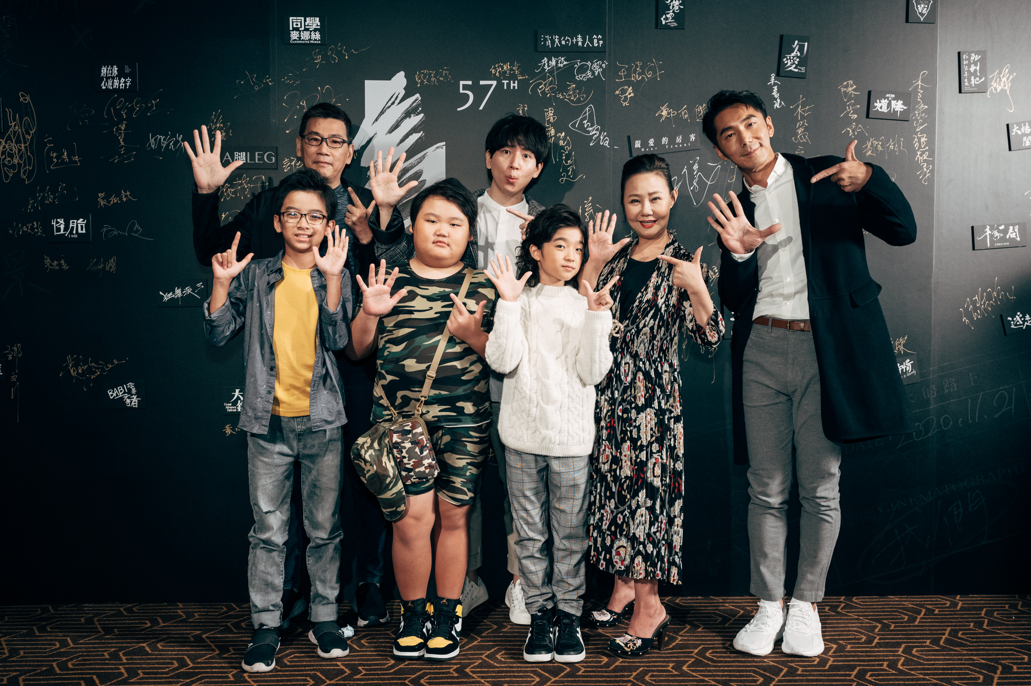 《嗨!神獸》主創人員昨晚出席金馬影展世界首映。(右起)演員李李仁、李祐銓、陳京甫、白潤音、呂雪鳳、導演池家慶、出品人陳其遠。
