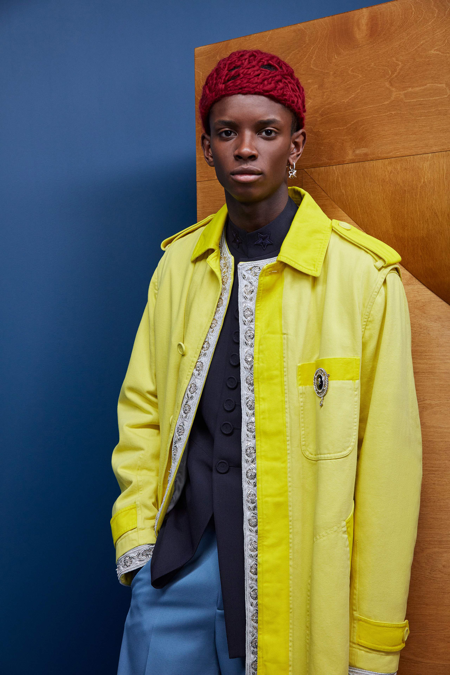 開場的刺繡大衣靈感來自法國學術最高殿堂之一的法蘭西藝術院(Académie des Beaux-Arts)院士制服──一套具有刺繡工藝的傳統燕尾服,Kim表示,從他執掌品牌男裝以來,已為幾位院士藝術家們製作過相關制服,這種與高級訂製服工藝一脈相承的時尚觀點延伸了本季男裝發想,服裝不僅是時尚的載體,更能古往今昔,牽引著歷史脈絡與珍貴遺產。大衣上頭繁複的鍍金洛神花紋刺繡細節源於大學長Marc Bohan於60年代所設計的高級訂製晚禮服。
