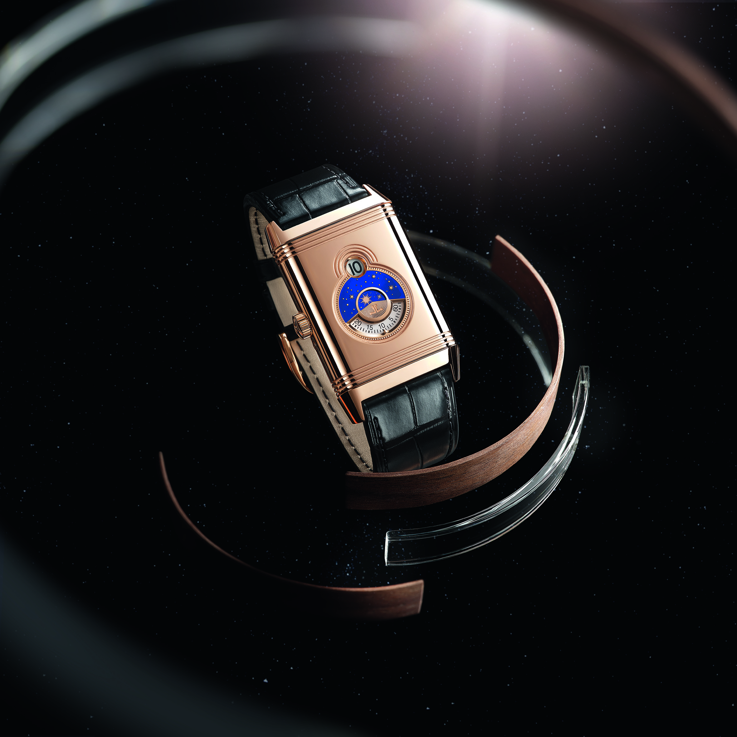 不過我們要談的不僅是複雜功能,而是回歸初心的九十週年紀念款有什麼全新的迷人風貌。號稱全新的複雜功能組合,注意,是組合,除了傳統年曆、時間顯示外,還多了月相,玫瑰金錶殼的正面看起來還是簡約的太妃針時分設計,6時方向則是小秒盤及月相顯示,12時方向為大型日期顯示,整體設計非常簡單而優雅,不過翻到背面才是重點。全新設計的讀時方式,將複雜功能重新佈局,葫蘆狀如一個數字「8」,上方小視窗為「跳時」小時顯示;下方則為「轉盤式」分鐘顯示,其中四分之三夾板塗上了如同夜晚星空的藍色漆,金色的星點代表夜空,天空下方小圓環內,則是金色太陽及月亮,緩緩穿過地平線,顯示晝夜交替,太陽光芒的放射狀飾紋則綴以「JL」代表標誌,非常細膩且用心。