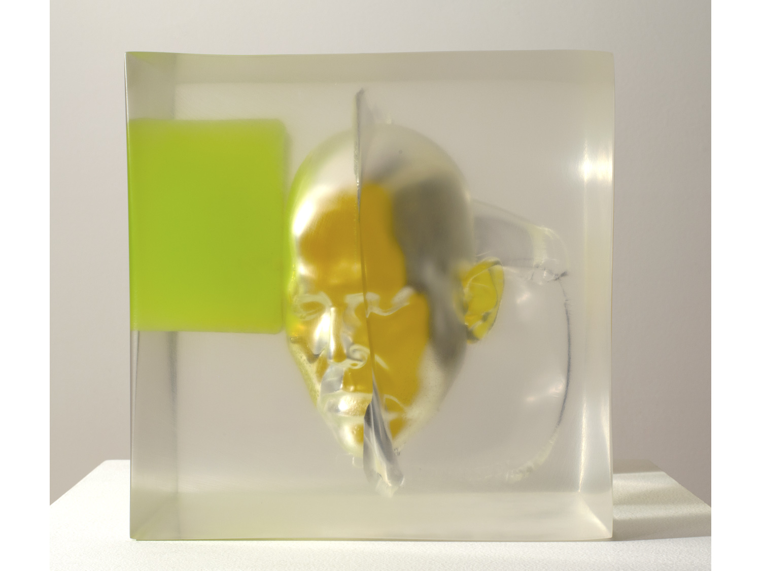 〈Encased Yellow Green|套中黃綠〉2017-18, Pigmented resin and acrylic|著色樹脂、壓克力, 23.8 x 21.9 x 23.8 cm。