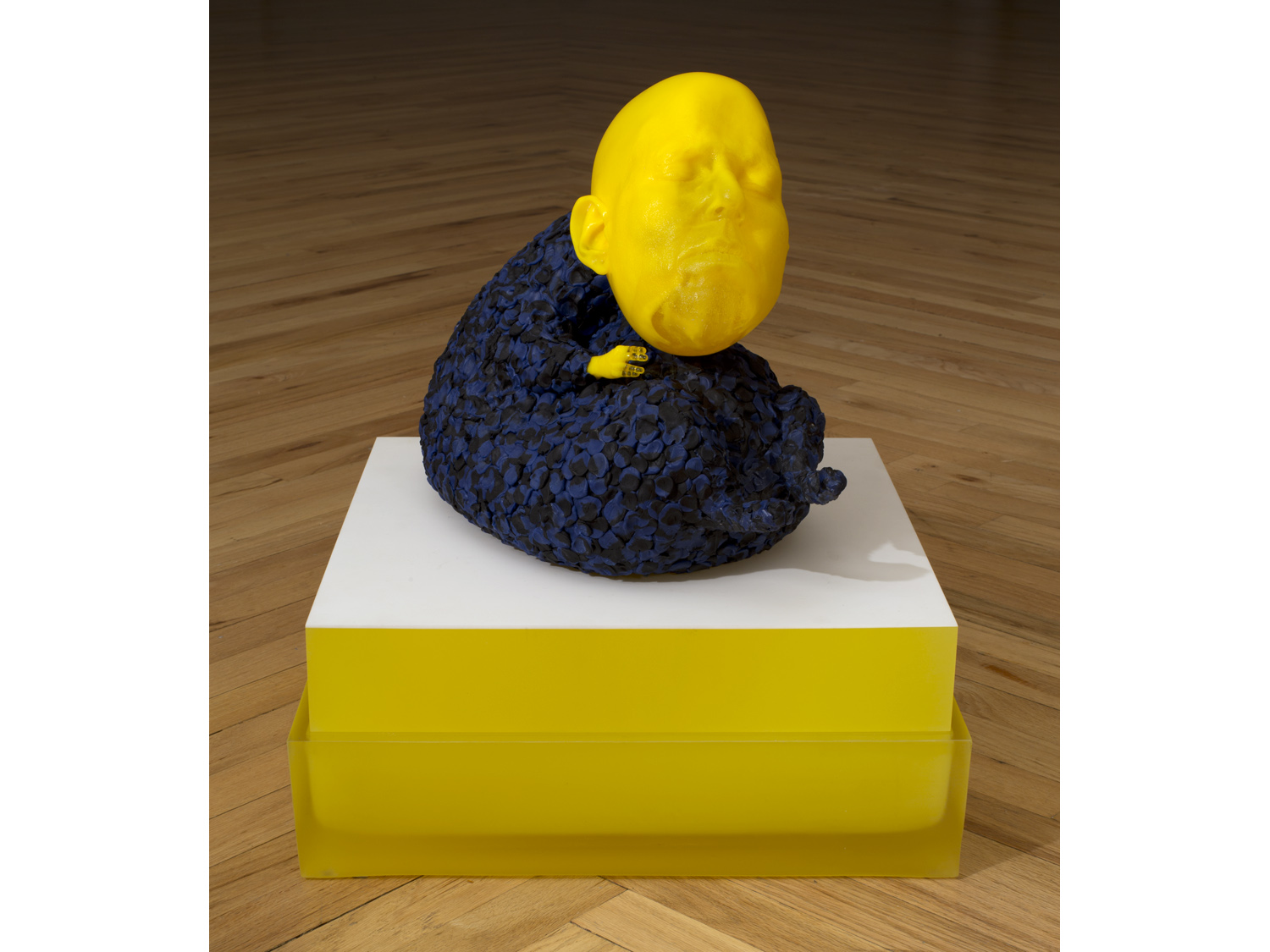 在兩件介於人類與動物之間的地面雕塑中,以擁有細緻皮膚肌理的3D列印龐迪克本人頭顱,銜接於極具表現力的扭曲身軀上。在〈蜷曲的灰〉中,其身軀被捲曲的形狀覆蓋住,或許暗示著人類或動物的毛髮、大腦、 腸子或動態意象,它的腳不成比例地小,且沒有胳膊或雙手,彷彿在吞噬著自己。〈黃藍黑白〉的身體表面看似紀錄著藝術家的觸碰,它短小的雙手,一隻縮進身體裡,另一隻向外伸出。這兩件作品或許是在休憩,抑或是根本上的喪失了行走能力呢,它們存在的力量是給予觀眾對自己心理動力的理解和反饋,讓我們的恐懼、希望和記憶逐漸強大。