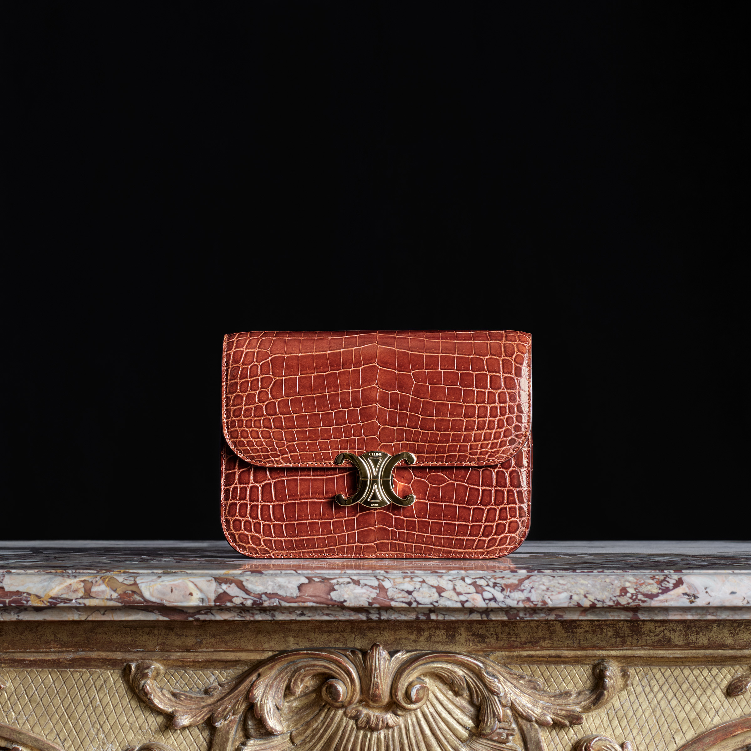 Celine Triomphe包款也是Hedi Slimane為Celine設計的第一批作品之一,它以純粹的當代美學,並重新構思經典元素的凱旋門鎖鏈紋章圖案而備受矚目。在Celine高級訂製Maroquinerie系列中,Celine Triomphe同樣採用尼祿鱷魚皮製成,並襯有光滑的山羊皮革,印有Celine Haute Maroquinerie 品牌標識,並包含一面鱷魚皮包邊的鏡子,完成一款Celine Triomphe包款需要12個小時的製作工藝。