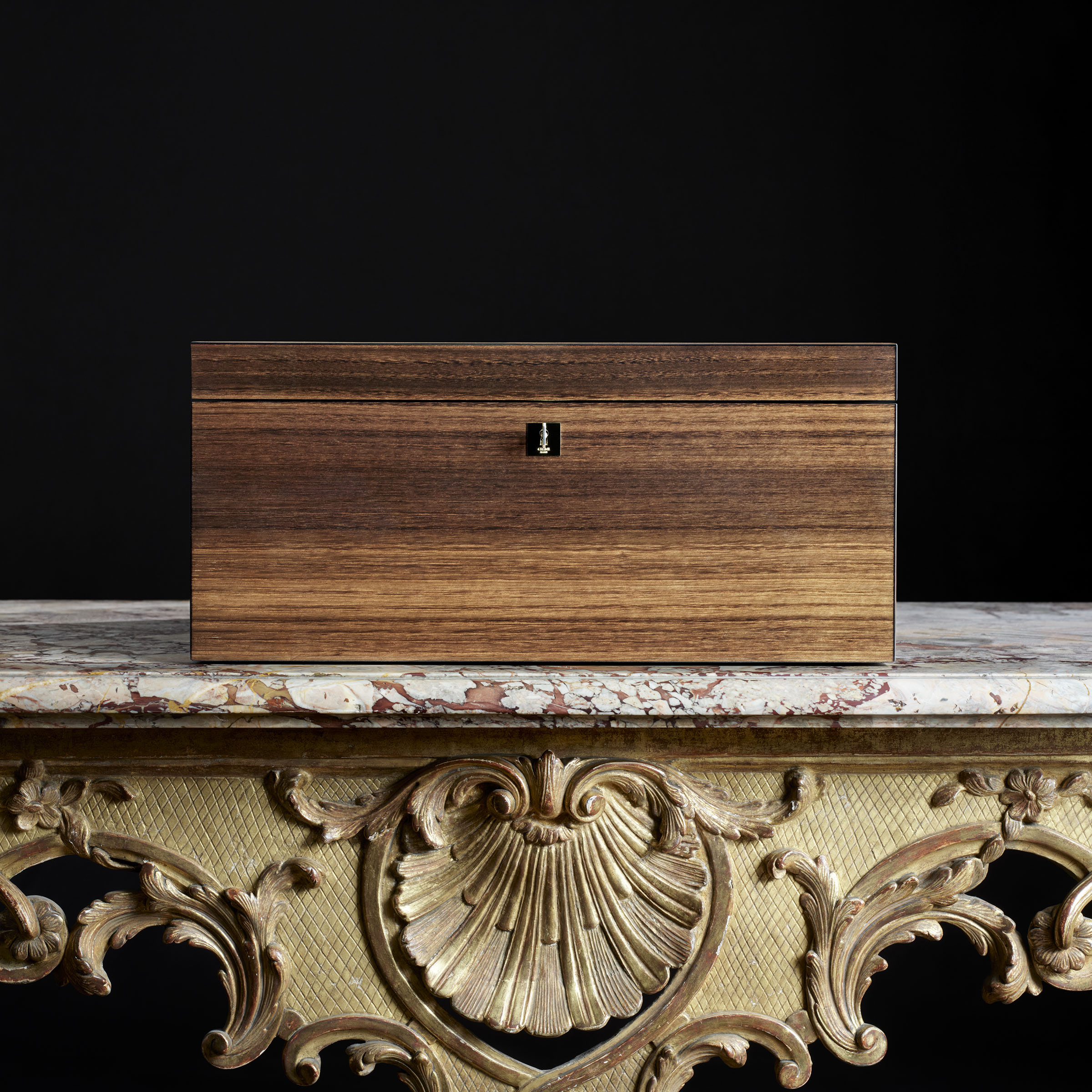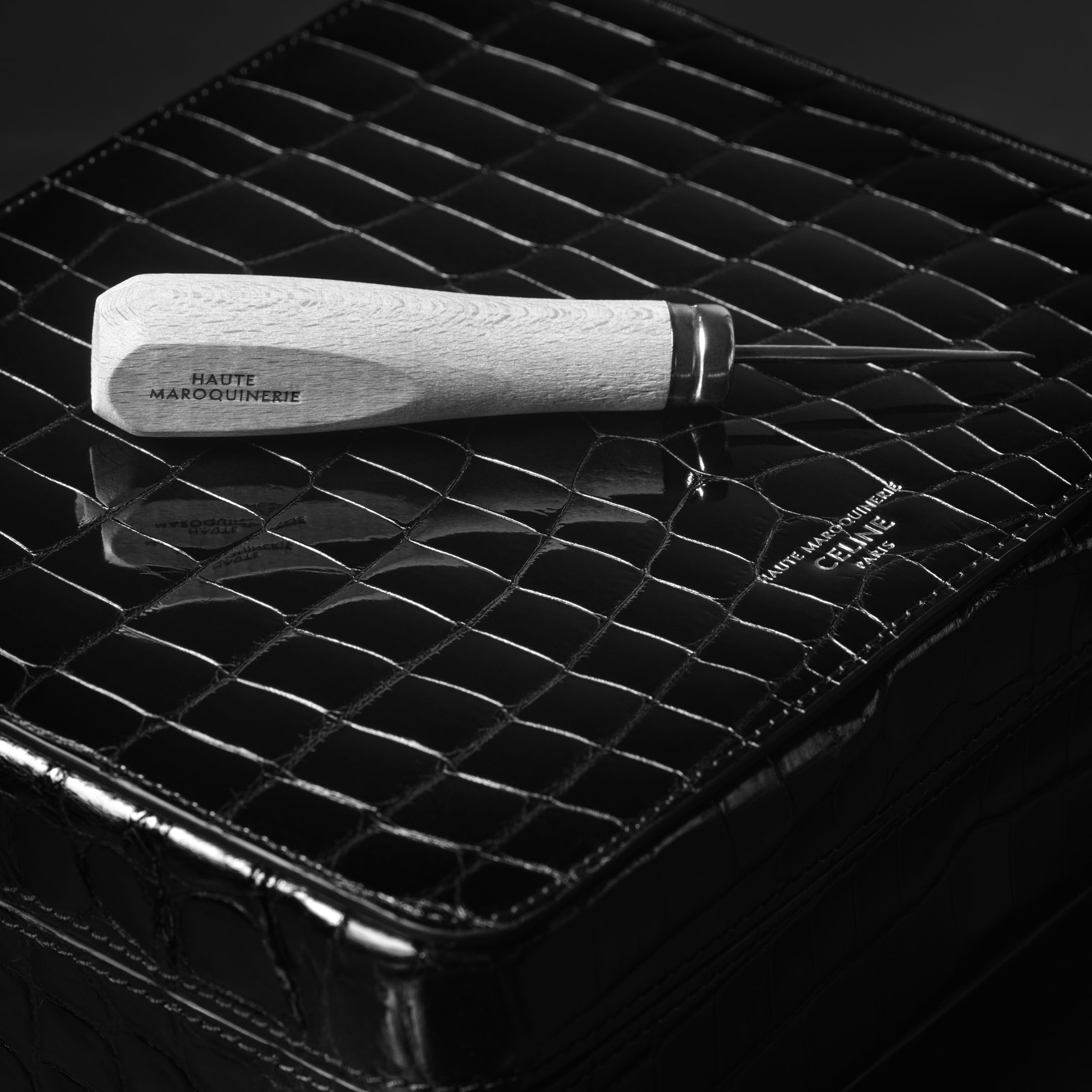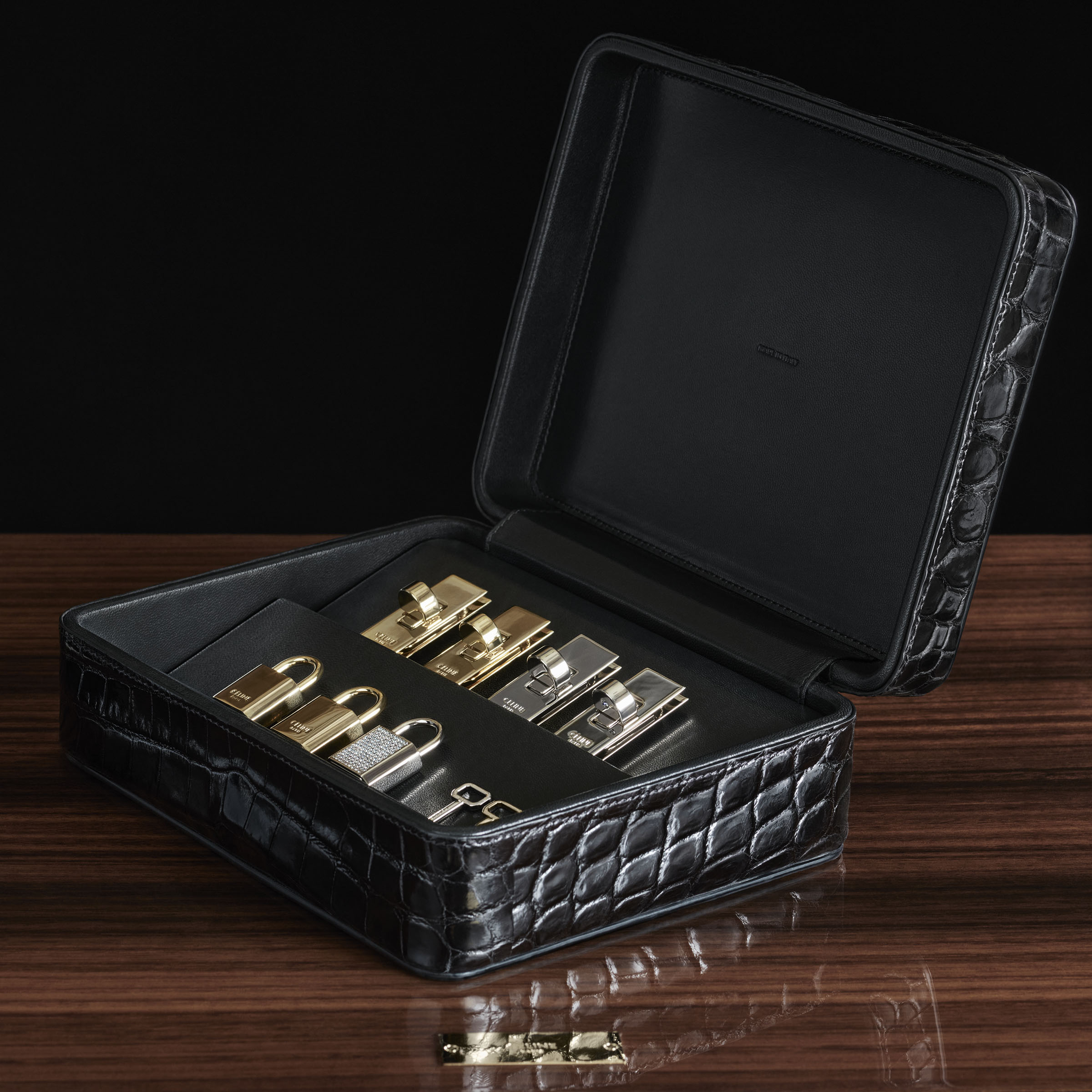 Celine高級訂製Maroquinerie系列的La Bijouterie飾有18克拉白金或黃金珠寶元素。每個模型的閉合都可以訂製鑽石,無論是密鑲亦或是單顆鑲嵌。Triomphe鎖釦採用 18 克拉黃金或白金製成,在鎖釦的隱蔽部分飾有單顆鑽石,或可在頂部密鑲鑽石。此系列的La Bijouterie每個型號的盒身都為一個塗漆的桉木盒子,盒子表面附有同樣用於包款的精美黑色皮革。