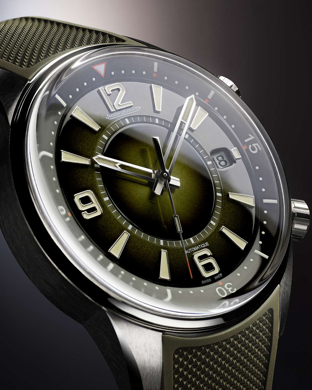 在設計上,Jaeger-LeCoultre Polaris Date日期顯示腕錶在直徑42毫米的錶殼融合緞面打磨修飾表面、倒角拋光錶耳及纖幼錶圈展現細緻考究的特色,錶盤設計糅合蛋白石裝飾、粒面裝飾和太陽放射狀飾紋,巧妙地區分活動內錶圈以至軌道式分鐘圈等各個重要的錶盤區域。由淺橄欖綠色漸變至蒼翠的雨林綠色的錶盤,按照不同角度的光線呈現不同色調,半透明漆面塗層為錶盤增添迷人的深邃感,令香草色時標更加鮮明易讀。腕錶搭載最新一代的 899 型機械機芯,提供70小時的動力儲存。為確保靈活多變的佩戴方式,Jaeger-LeCoultre Polaris Date 日期顯示腕錶搭配綠色橡膠錶帶,並配備快速更換錶帶系統。腕錶與一系列積家錶鏈和錶帶相容,只需數秒即可輕鬆更換錶帶。