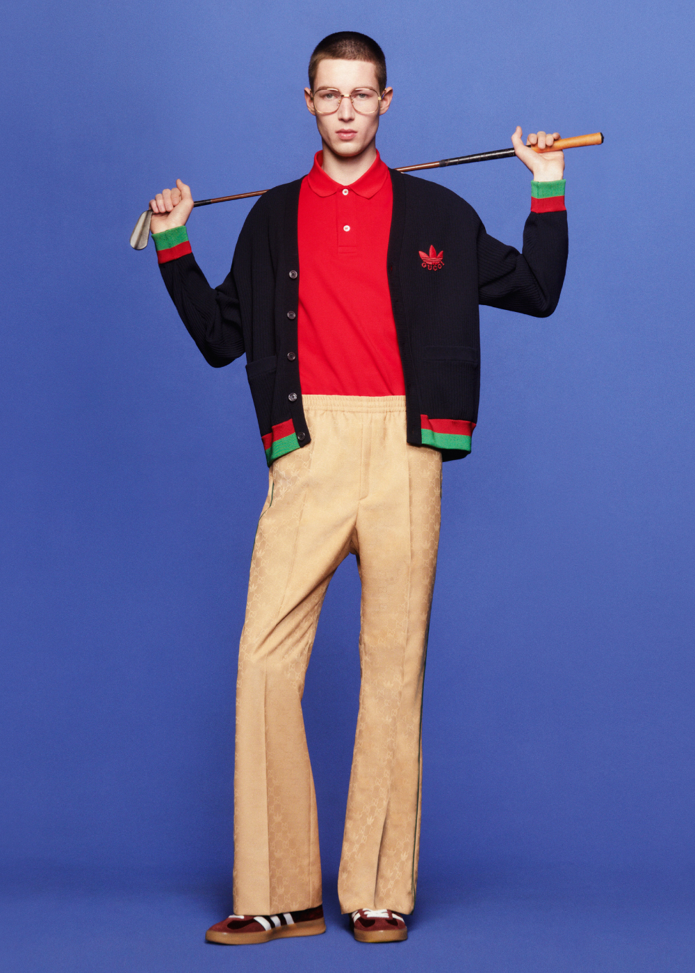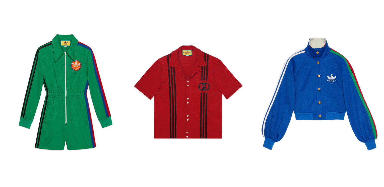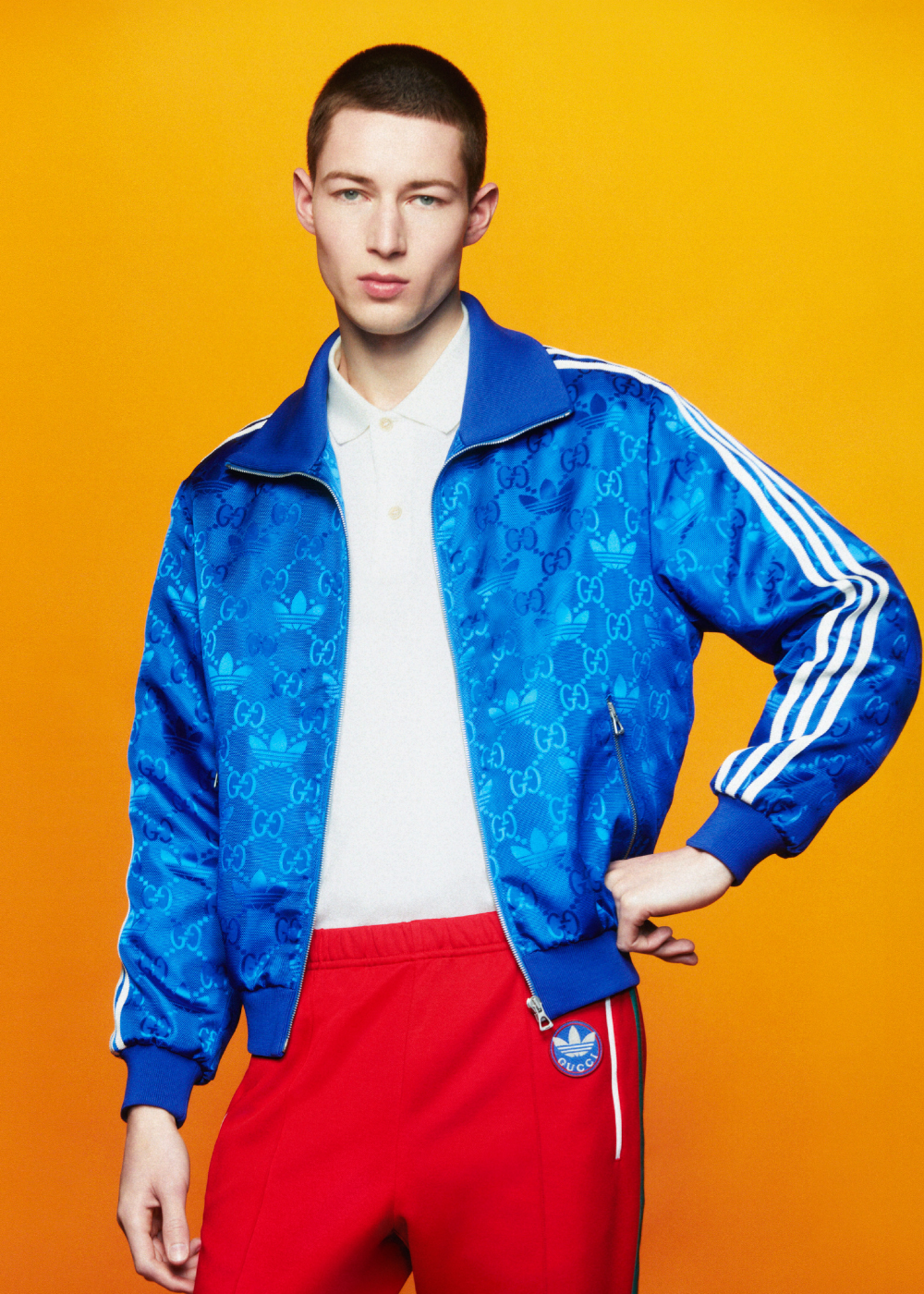 adidas x Gucci 綠色連衣褲、紅色針織polo衫、藍色紅綠織帶運動外套 by Gucci