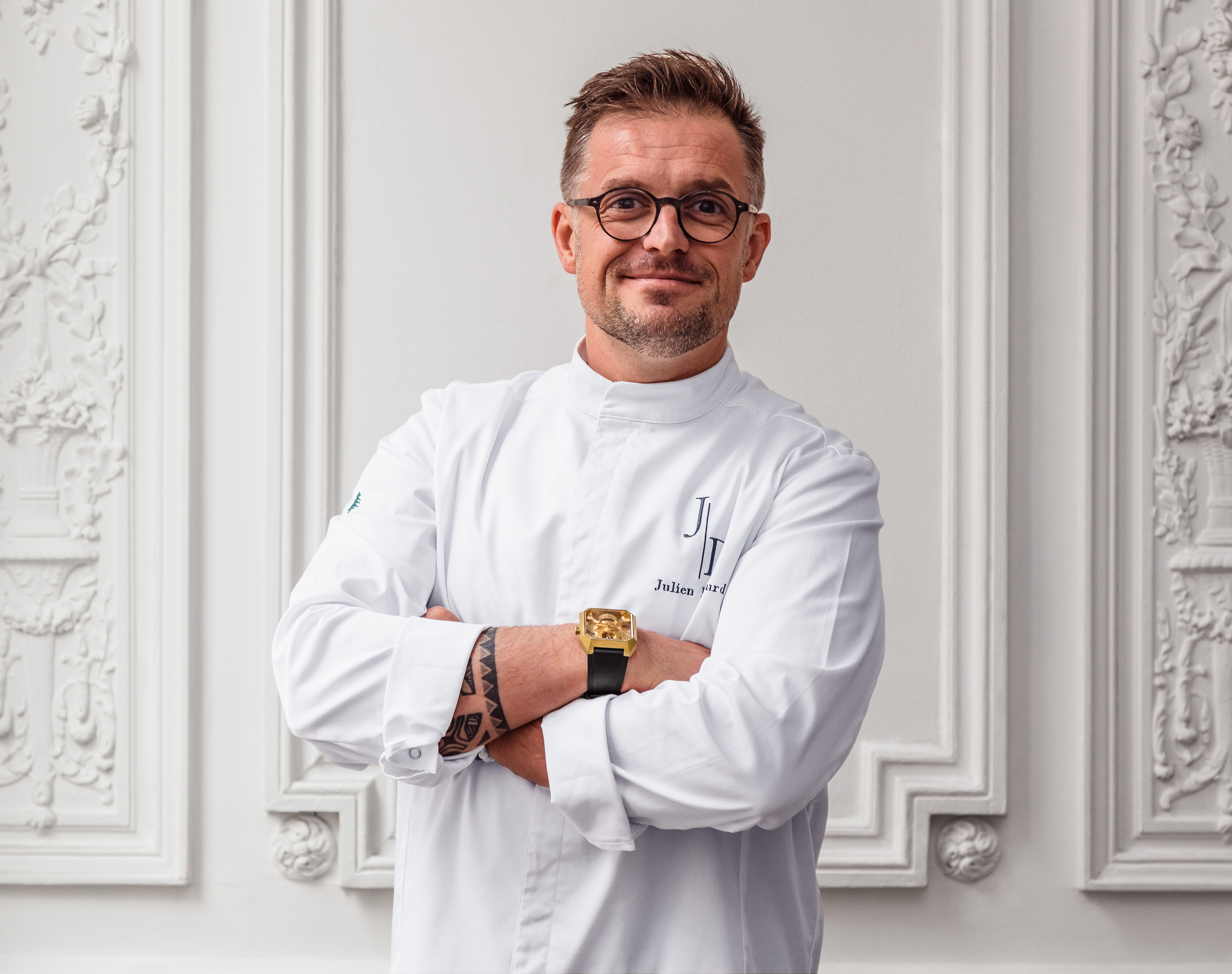 大師創作腕錶造型甜點,以加勒比風味薯片作餅底,上面一塊巧古力餅乾再加一層焦糖,周圍加上巧古力慕絲,然後壓上可可脂,再噴上天然材料色素,模擬錶殼的青銅物料;一塊巧古力威化灑上金粉,造出骷髏頭及兩根交叉骨頭的模樣。