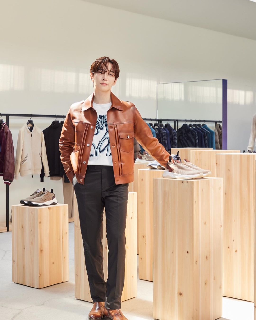 李俊昊出席Berluti韓國2023秋冬新品預覽會,身著Patina 古法染色皮革單寧外套,搭配Frame Scrittto 上衣及夜藍色克什米爾直筒休閒褲。