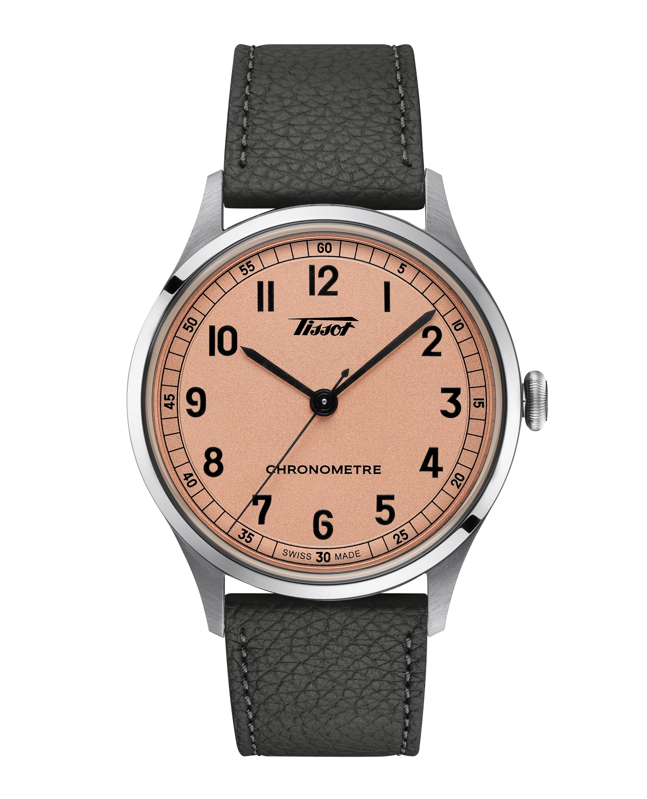 這回,天梭表承載品牌歷經百年凝聚的製錶實力,融合1930年代的美學設計與COSC認證機芯的精準度,重現傳奇腕錶過往的美學關。Heritage COSC 1938自動款腕錶在設計上完美復刻1938年所推出的經典錶款,於柔軟的噴砂錶面上裝飾著浮雕阿拉伯數字,搭配棒形指標清晰報時,外圈則飾以鐵道刻度,提供「鮭魚色」與「煤灰色」兩種錶盤顏色選擇。所搭配的快拆設計立體紋路皮革錶帶同樣呼應當年的簡約魅力,皮革錶帶亦會隨著時間推移,逐漸呈現出專屬的復古韻味,展現獨有個性。