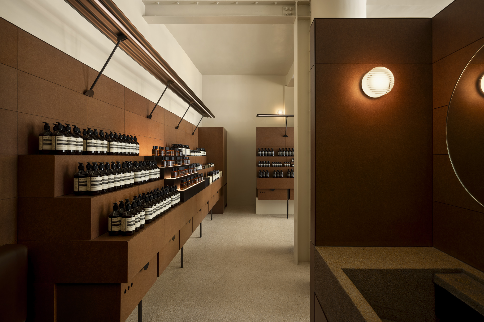 寬敞設計的走道讓人們可以恣意地穿梭移動、聚集交流,如同市場裡的人們會不停水平垂直地交錯,探索不同的店家與攤販。店中的產品展示層架,由盒狀階梯式堆疊而成,令人不禁聯想起當地市場常見的蔬果籃箱。這些層板主要由硬質木板製成,通常用作市場中的包裝材料,同時硬質木板的使用也考量永續,設計團隊使用混合邊角料的木頭,再以高壓壓製而成。層架的高度與深度皆精心測量過,讓產品能夠明確被看到,如同傳統市場的中常見的商品呈現方式。上方整齊擺放了Aesop全產品系列,從層架縫隙中,可見特別訂製的長板燈具懸浮在產品上方,借鑒了市場攤販亮眼的打光美學且呼應市場中的招牌與鐵皮,閃耀著迷人光芒。