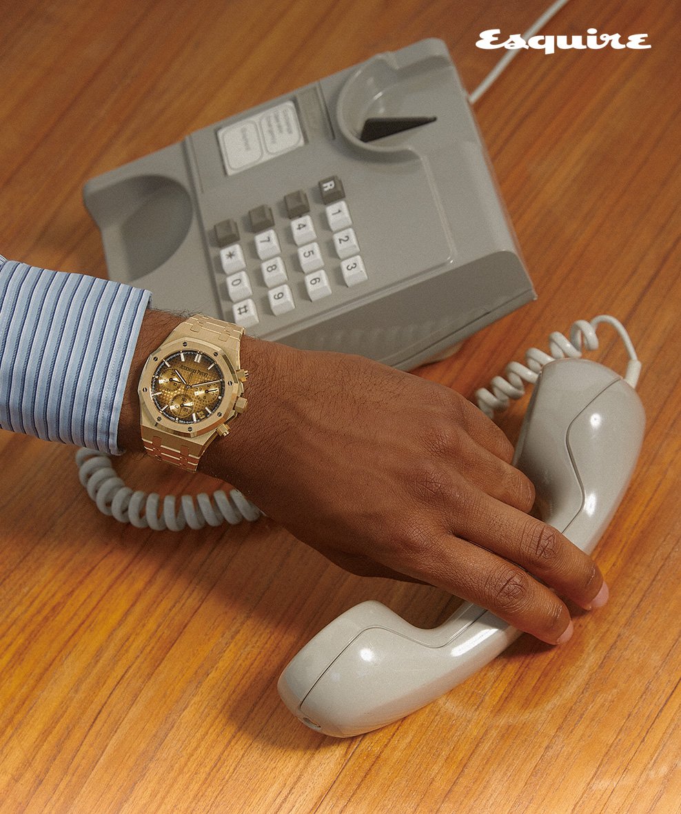 Royal Oak自動上鍊計時碼錶 41毫米18K黃金錶殼與錶鍊 by Audemars Piguet;襯衫 by Polo Ralph Lauren