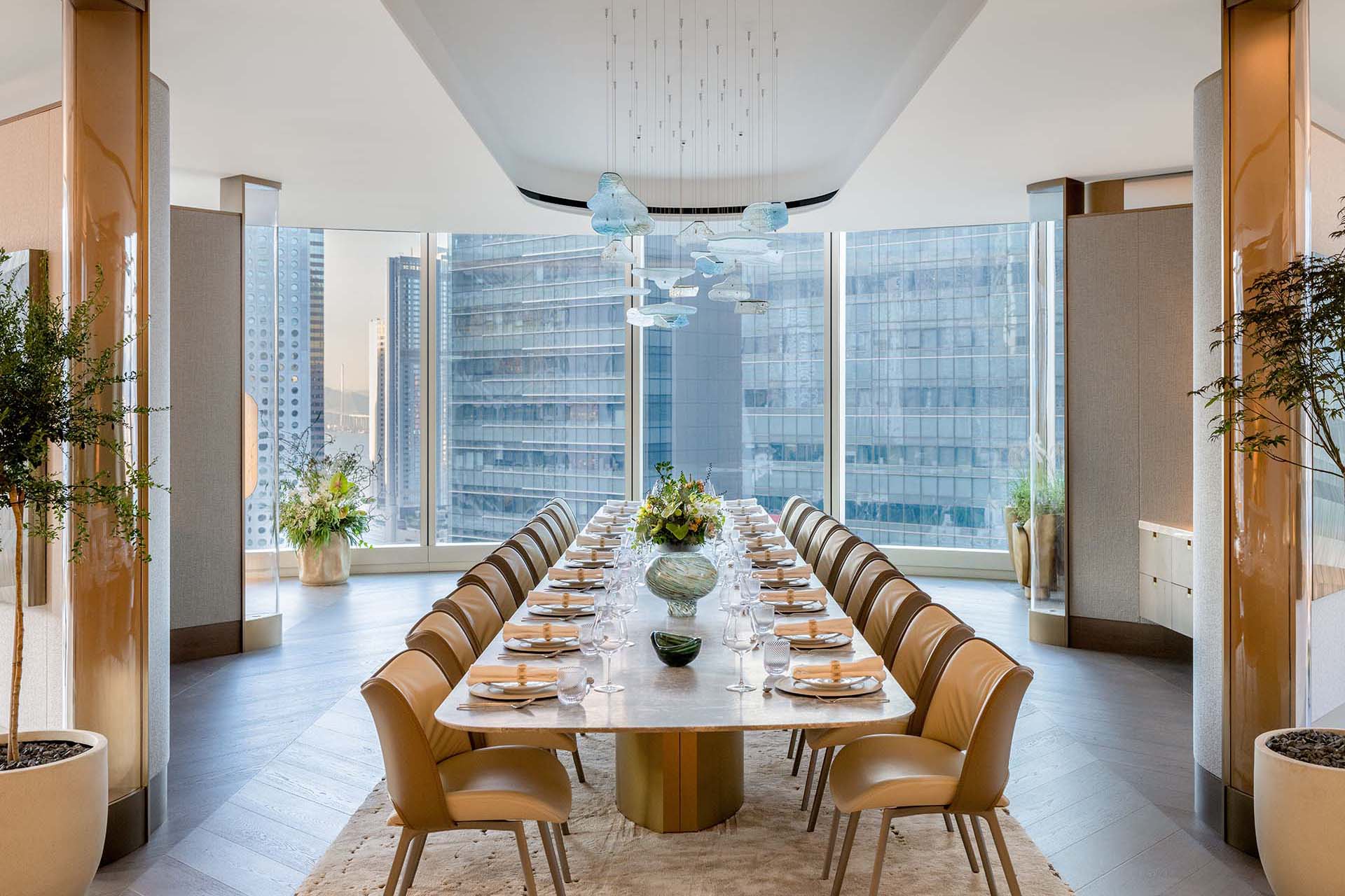 The Henderson大樓由世界知名建築事務所Zaha Hadid Architects(ZHA)設計,靈感來自香港市花──洋紫荊的含苞待放之美,而位於其中的AP House也同樣延續了這流暢有機的線條設計。內部裝潢由香港室內設計師Samantha Soo操刀,600平方米的空間不僅高雅大氣,將源自洋紫荊花的靈感遍佈每個角落,更融入汝拉山谷的自然元素,讓人一進門就能感受到一種放鬆的節奏。