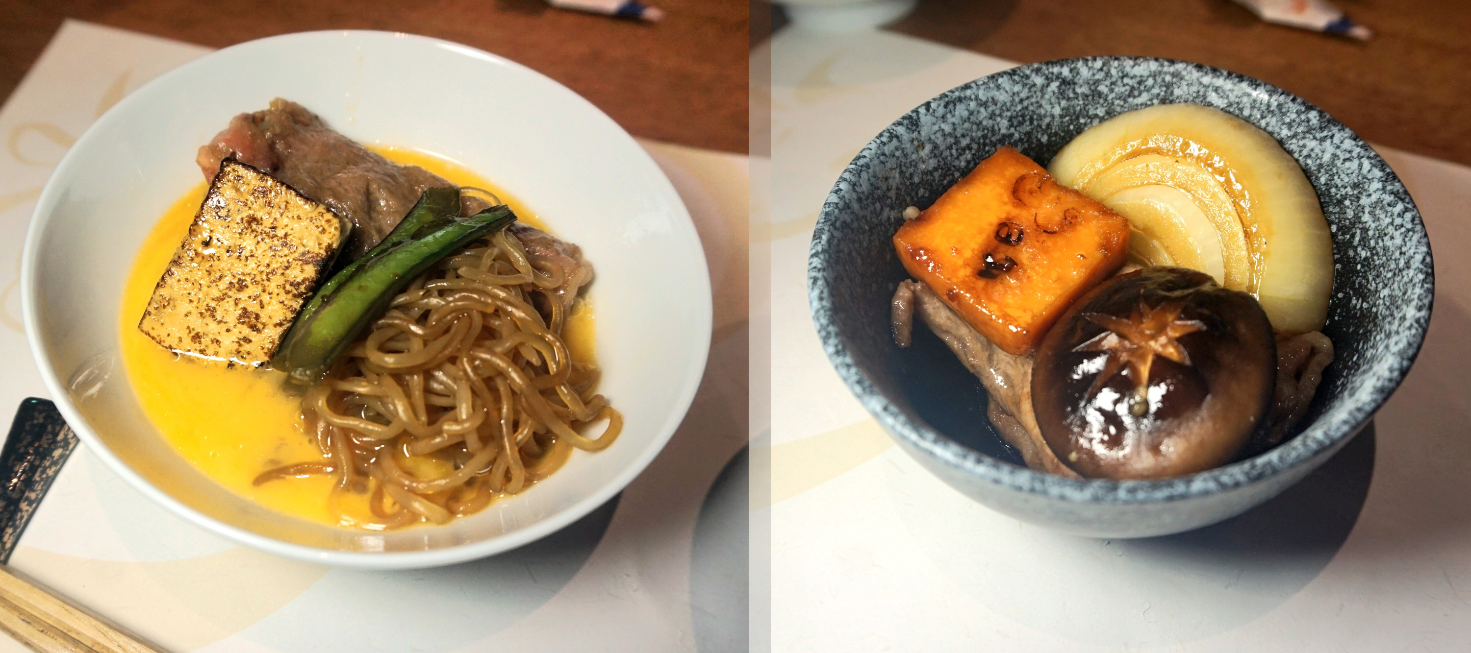「極上・日山」套餐中的壽喜燒會供應兩片牛肉,第一片以沾蛋液的形式呈現,搭配Q彈粉絲、時蔬與豆腐,油脂結合蛋香口感溫潤柔滑,配料相佐下更顯豐富口感,同時讓濃郁的香氣得以平衡;第二片肉則是單純的壽喜燒醬汁搭配香菇、蘿蔔呈現,肉片先是感受到醬汁的鹹香之氣,接著微甘的肉香隨即從中浮現,香菇吸滿醬汁後鹹鮮多汁,十分下飯。而在享用完肉品後,將沾過肉的蛋液倒入飯或烏龍麵中享用,將能更進一步感受和牛肉脂帶來的香氣,以豐富飽滿的滋味為用餐留下完美的記憶點。