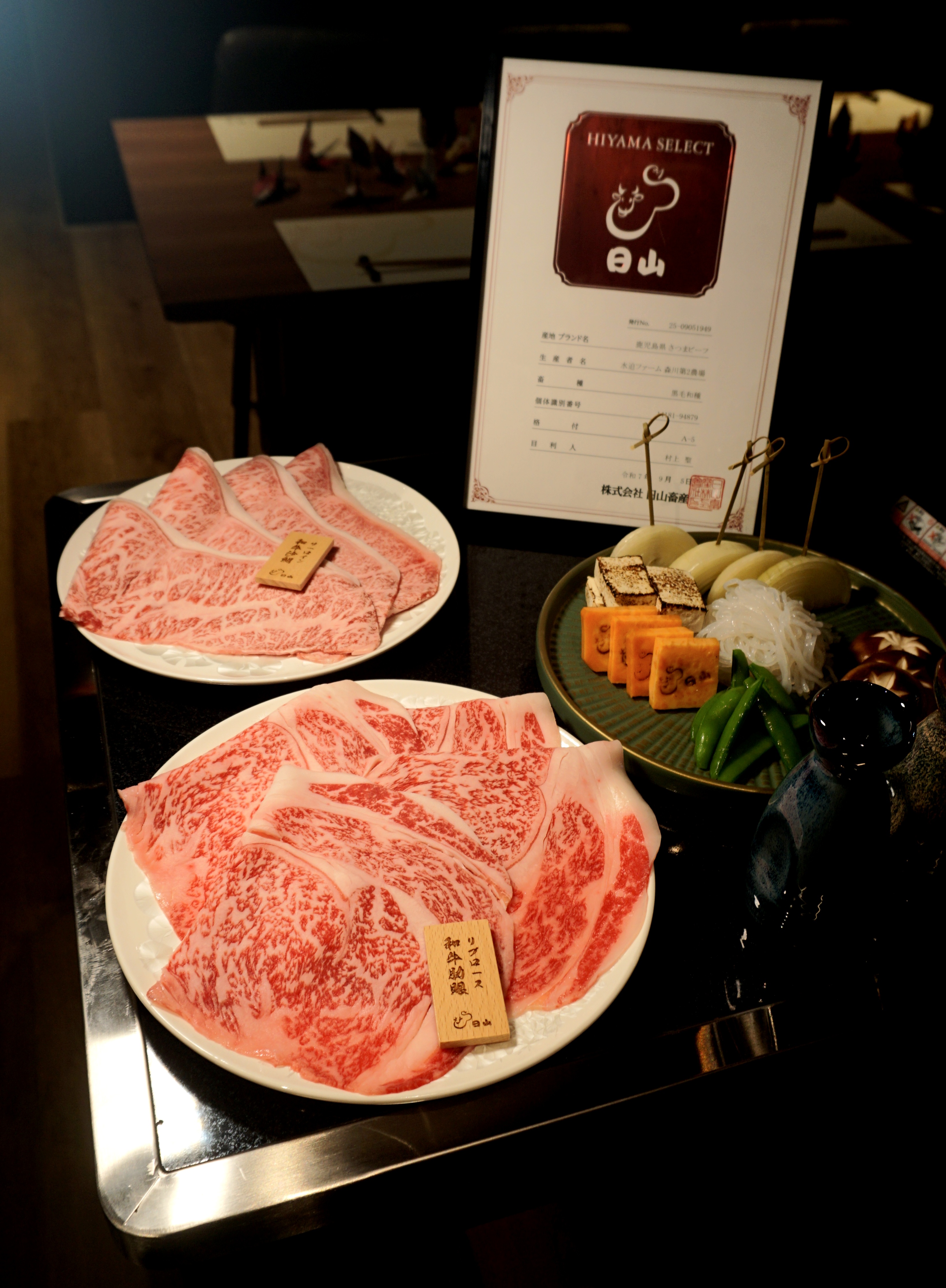 為讓每片肉都能展現最佳風味,日山特別訂製鑄鐵鍋、壽喜燒推車,由專人桌邊服務涮烤,恪守東京本店的火力、溫度、順序。作為傳統關東派壽喜燒,使用傳承百年的秘製壽喜燒醬汁,彰顯和牛最迷人的油花、油質與肉質的魅力。台北店開幕首波選以鹿兒島A5等級薩摩牛,每片肉片講究在55~60公克之間,厚度達2.5mm,讓和牛與壽喜燒醬汁的風味得以平衡。