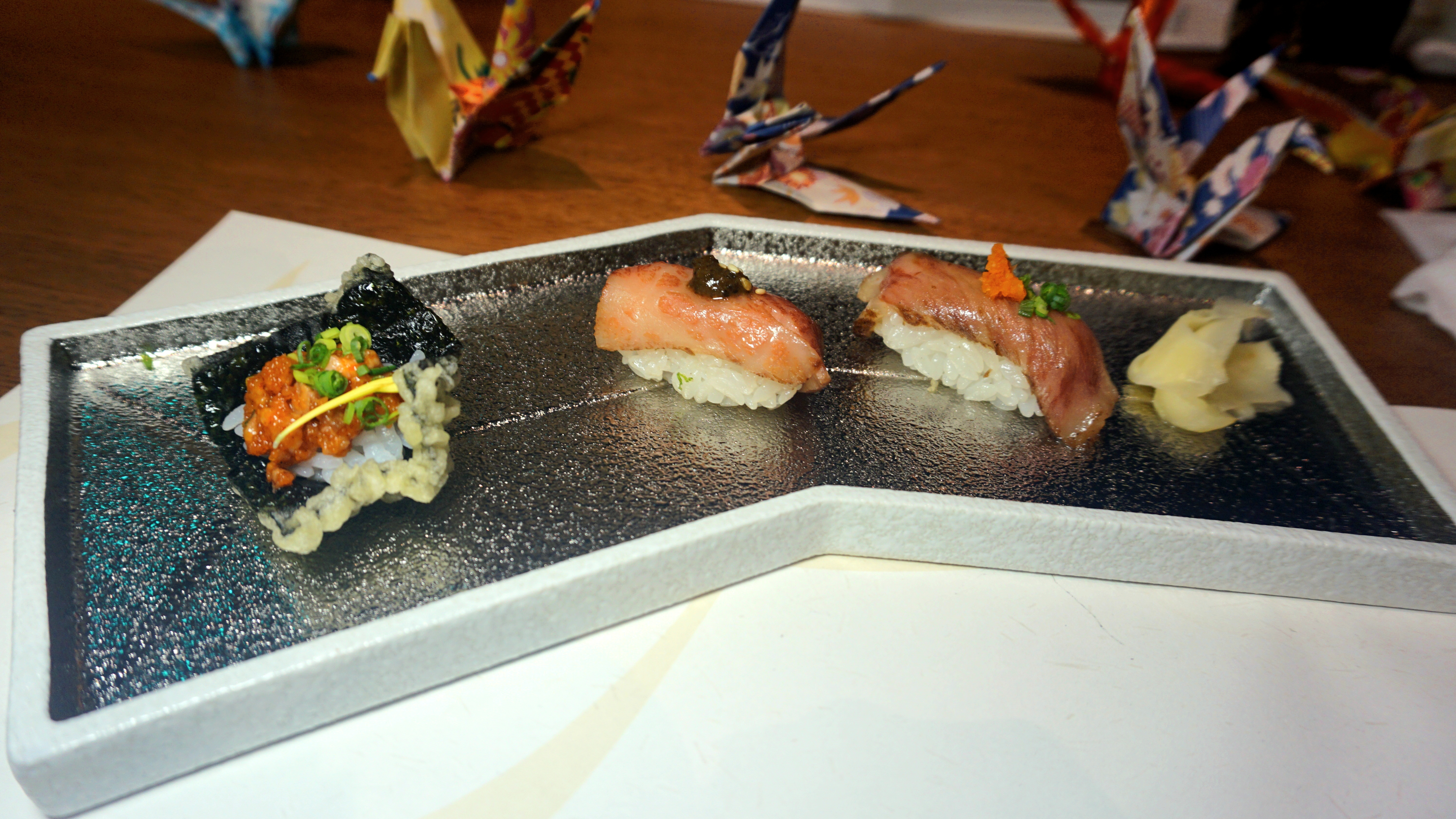 造里的「海之幸 刺身三味」以季節漁獲為主的刺身三味,近期供應的黑鮪魚大腹、油脂滑順,入口的油香媲美和牛口感,而來自德島鳴門海峽渦流裡捕撈的鳴門鯛經兩天熟成,口感緊實彈牙。而燒皿「時魚塩燒」近期則供應來自大溪漁港的黑喉魚,以公斤數足一公斤的肉魚藉由鹽烤帶出肉質的肥美滋味,儘管套餐料理以牛肉為主,但在海鮮的處理上依舊毫不馬虎。