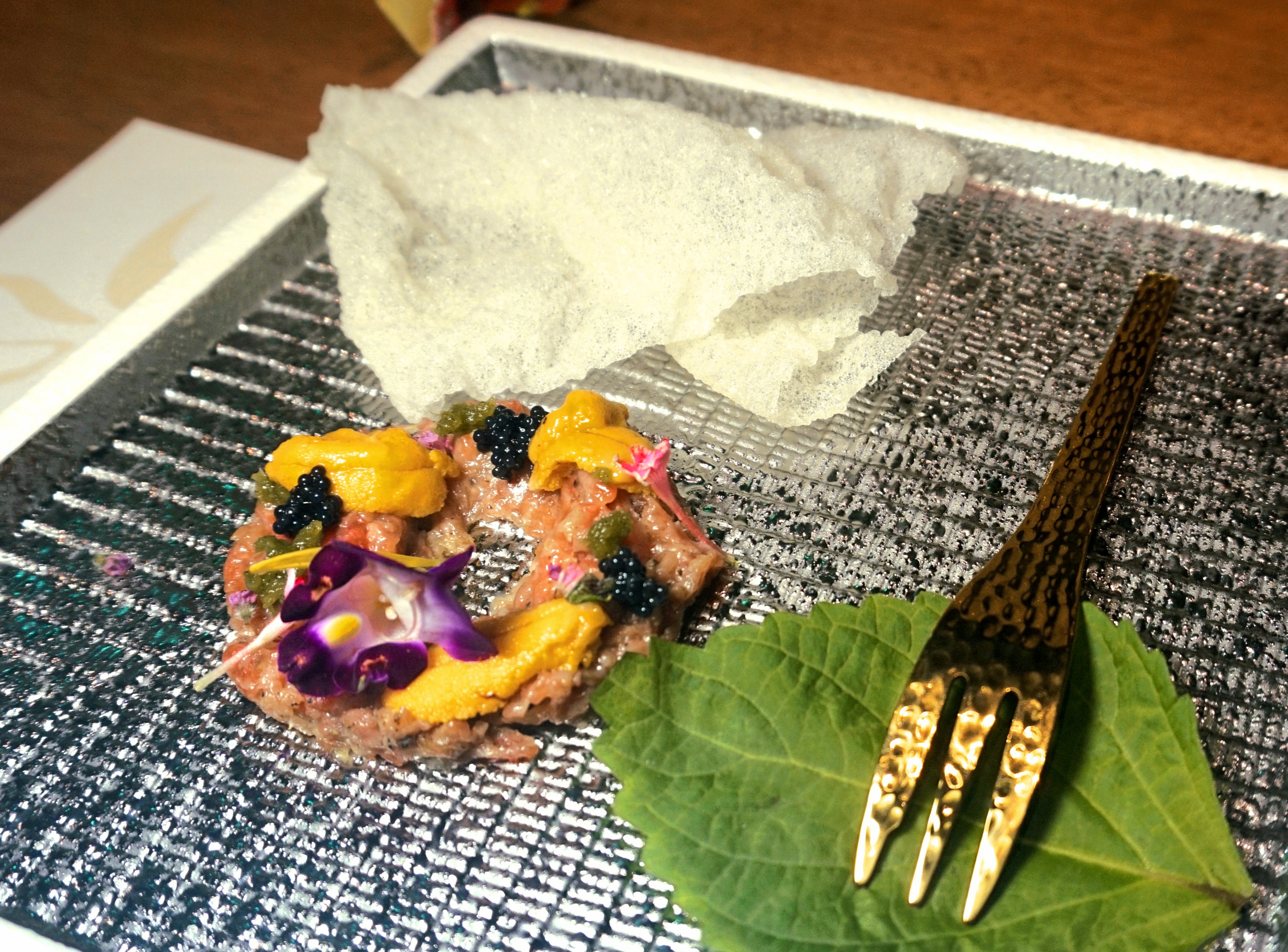 先付「炙燒和牛塔、真山葵」更讓人印象深刻,將和牛以丁狀、泥狀共兩種狀態搭配信州味噌、海膽與魚子醬點綴,盛裝於酥炸米餅上享用,兩種狀態的和牛讓肉香甘美迅速擴散於口中的同時,帶有些許柔韌的咬勁,海膽的甜味與魚子醬的鹹鮮相佐,更讓和牛碰撞出具層次感的鮮美滋味。