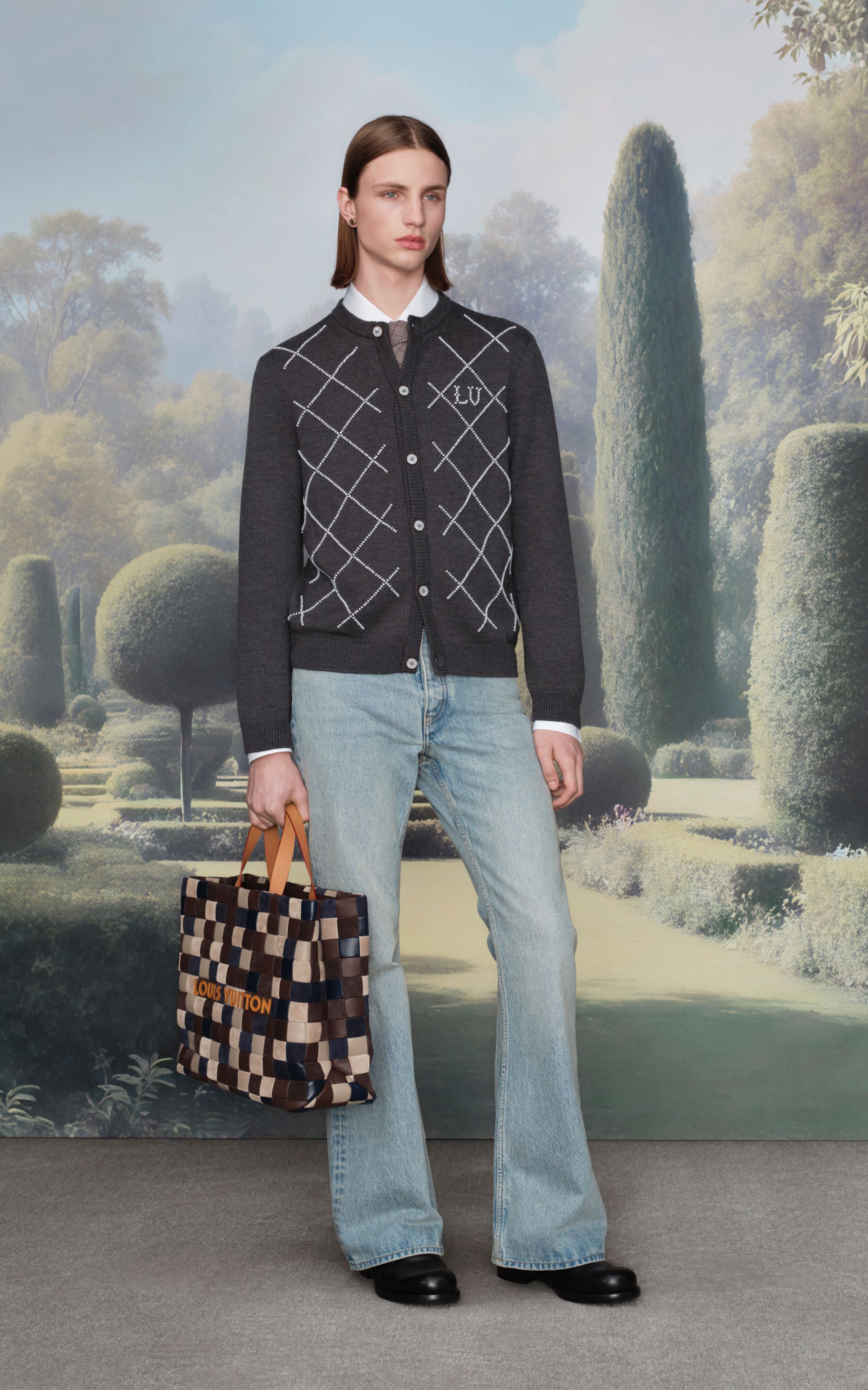 隨著日光漸隱,視角轉入莊園宅邸。服裝語調轉向華麗而內斂,面料呼應府邸內裝與晚宴規範:三件式羊毛西裝、微喇叭長褲與皮革拼接外套,重構夜晚的秩序。Monogram與Tartan圖案交錯,Damier Pixel與Damoflage交織於毛衣與夾克之間,營造自在的正式感。以狐狸、皇冠與絲帶組成的LV Emblem,鑲嵌寶石與亮片,點綴如燭光微閃,為靜謐的莊園注入當代從容。