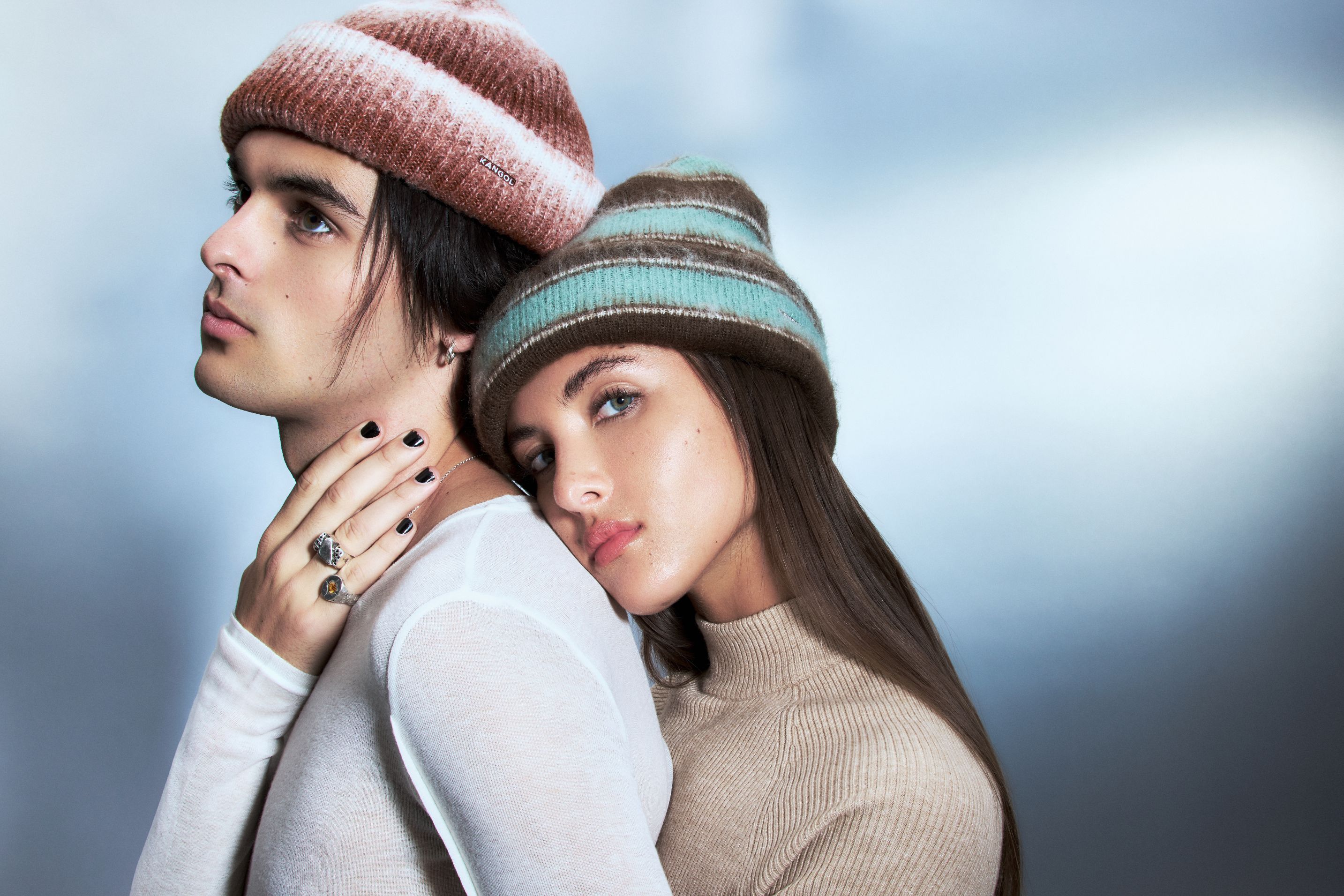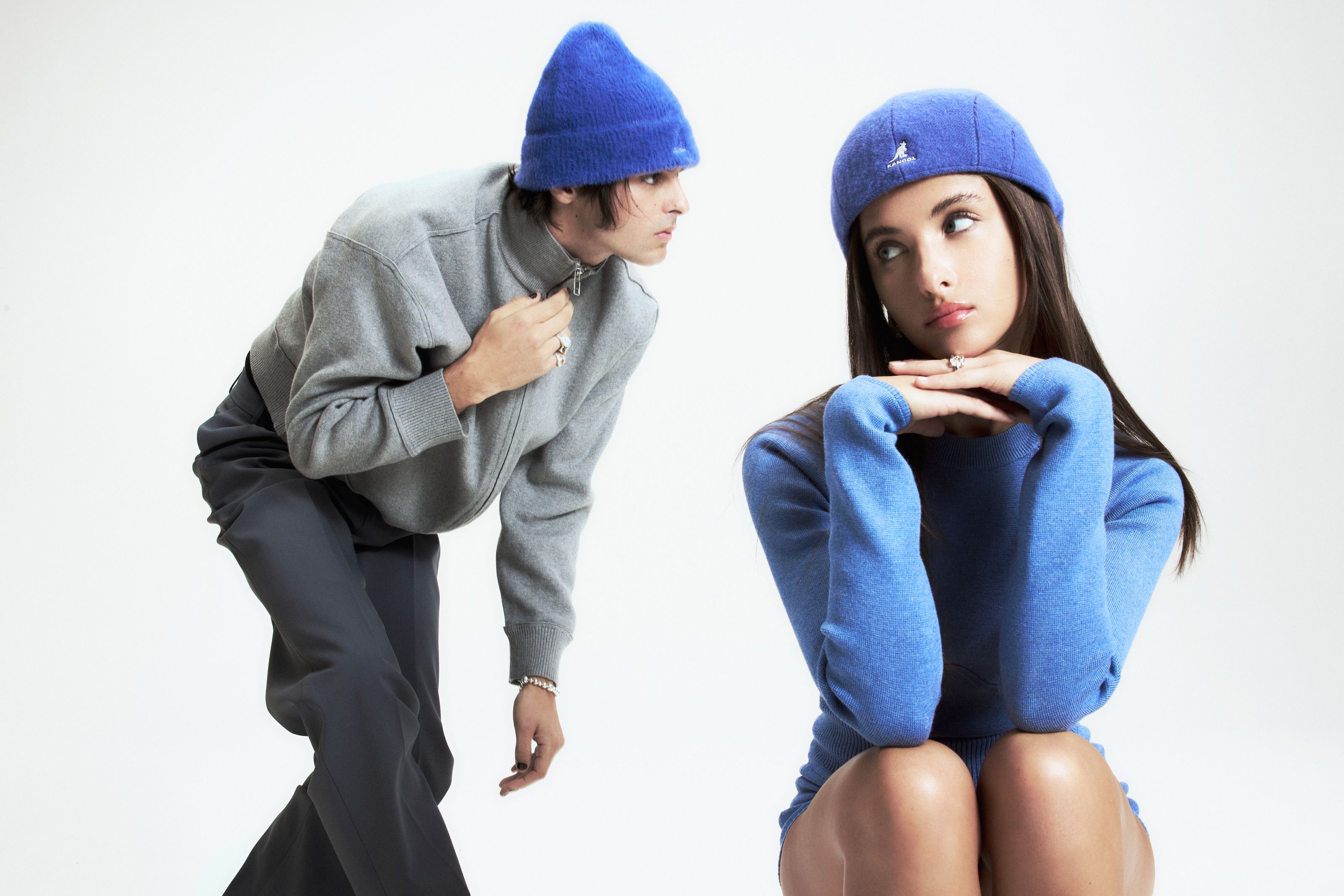 延續KANGOL編織語彙,HEATHERED混色漸層頭顱帽與FUZZY撞色條紋頭顱帽帶來柔軟色彩與多變造型力。品牌經典亦迎來新色Furgora鐘型帽與504 Wool鴨舌帽以秋冬暖調與質感色系,重塑標誌性輪廓。