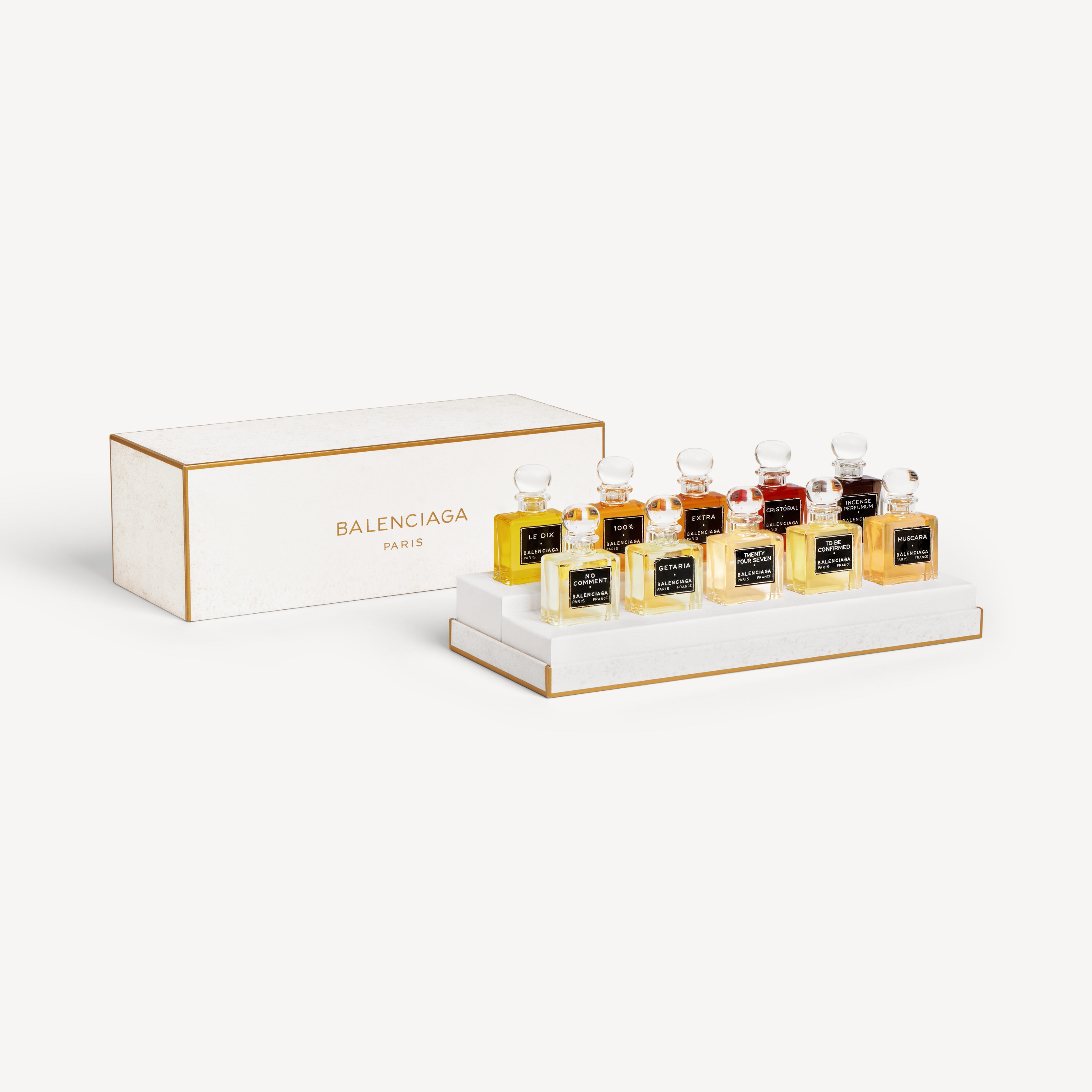 本次登台的十款香精——No Comment、Getaria、Twenty Four Seven、To Be Confirmed、Muscara、Le Dix、100%、Extra、Cristóbal、Incense Perfumum——以結構自由、具張力的配方重新定義品牌的嗅覺輪廓。珍稀香精油與前衛調香手法交織,使每款香氣皆呈現層次豐富、充滿個性的「Balenciaga式存在感」。