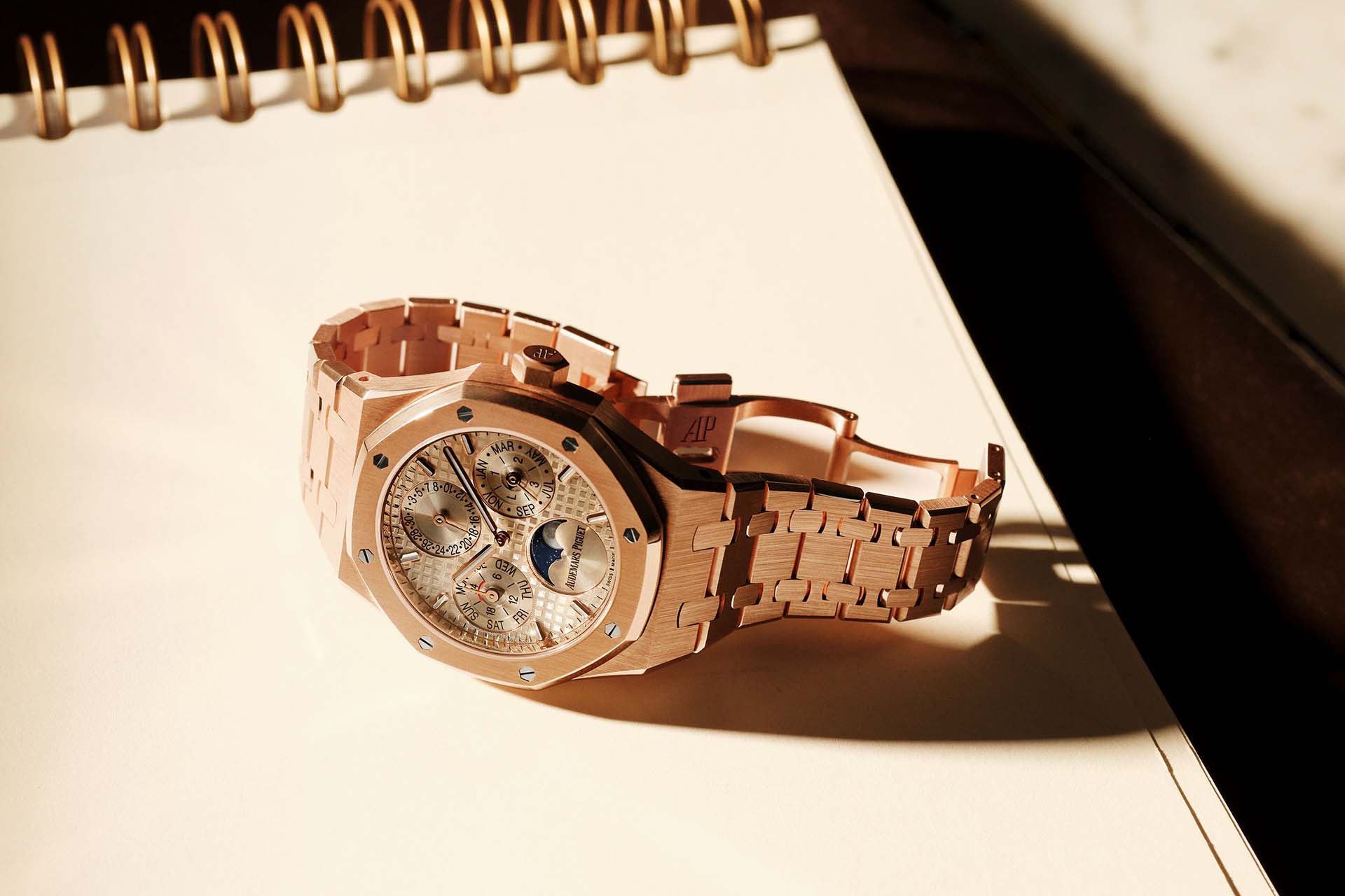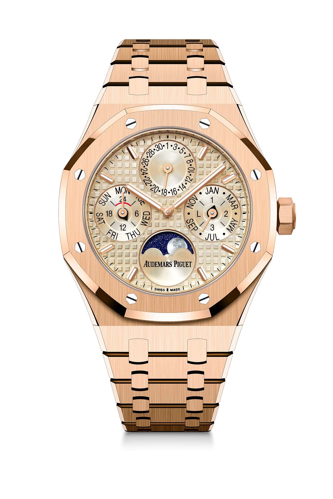Royal Oak皇家橡樹系列自動上鍊萬年曆腕錶38毫米精鋼錶款。 | Royal Oak皇家橡樹系列自動上鍊萬年曆腕錶38毫米18K玫瑰金錶款。 |