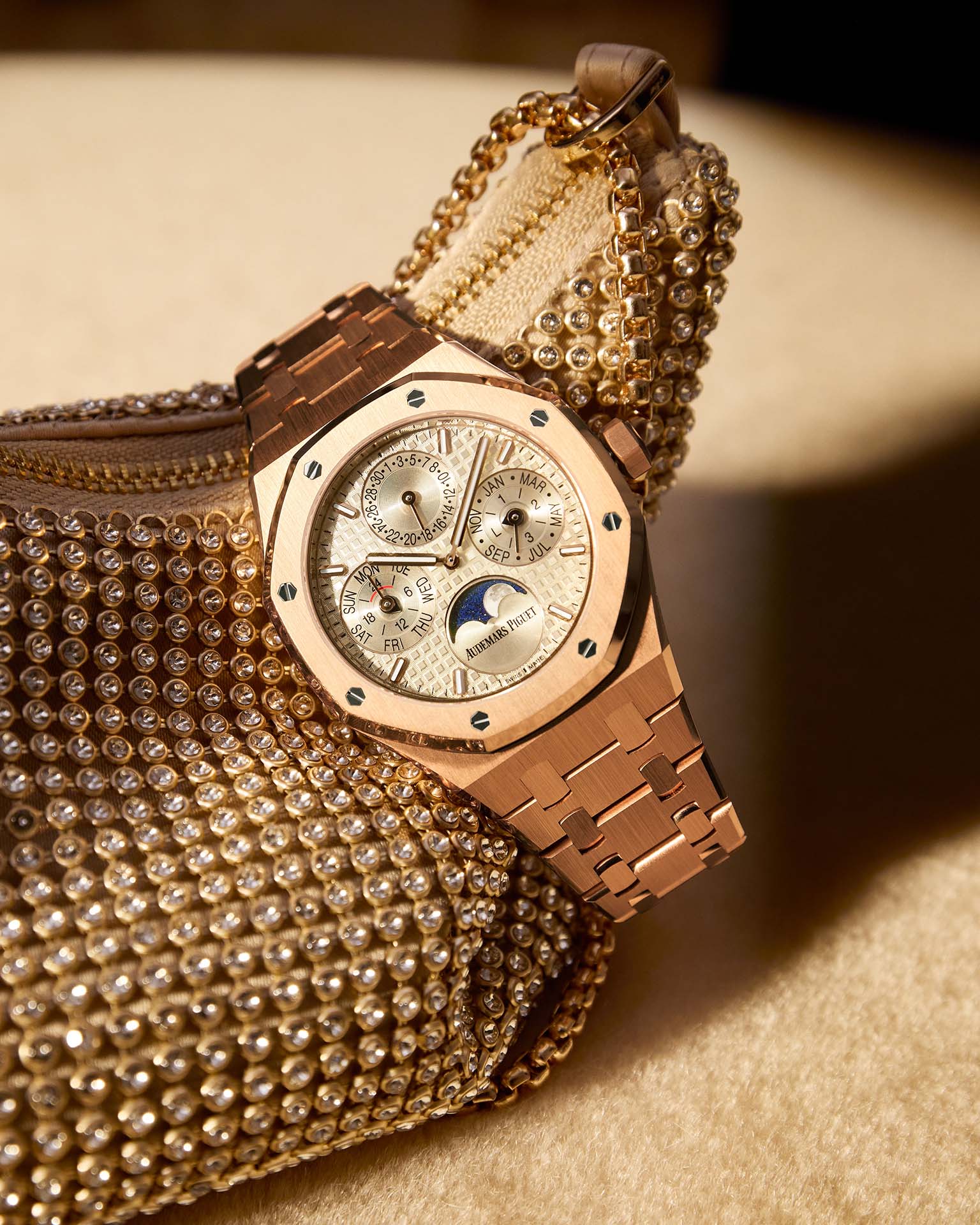 這是品牌首次在38毫米錶徑中實現萬年曆功能,對愛彼AP而言,是一次美學與技術的尺度挑戰。精鋼與玫瑰金兩種版本各有氣質:精鋼款的淡藍色錶盤呈現低調的科技感,18K玫瑰金款與米色錶盤則帶出溫潤的典雅。經由透背底蓋可以看到22K金自動盤與手工倒角的機芯橋板──那是一種屬於愛彼AP的細節執著:即使藏於錶背,也要完美無瑕。