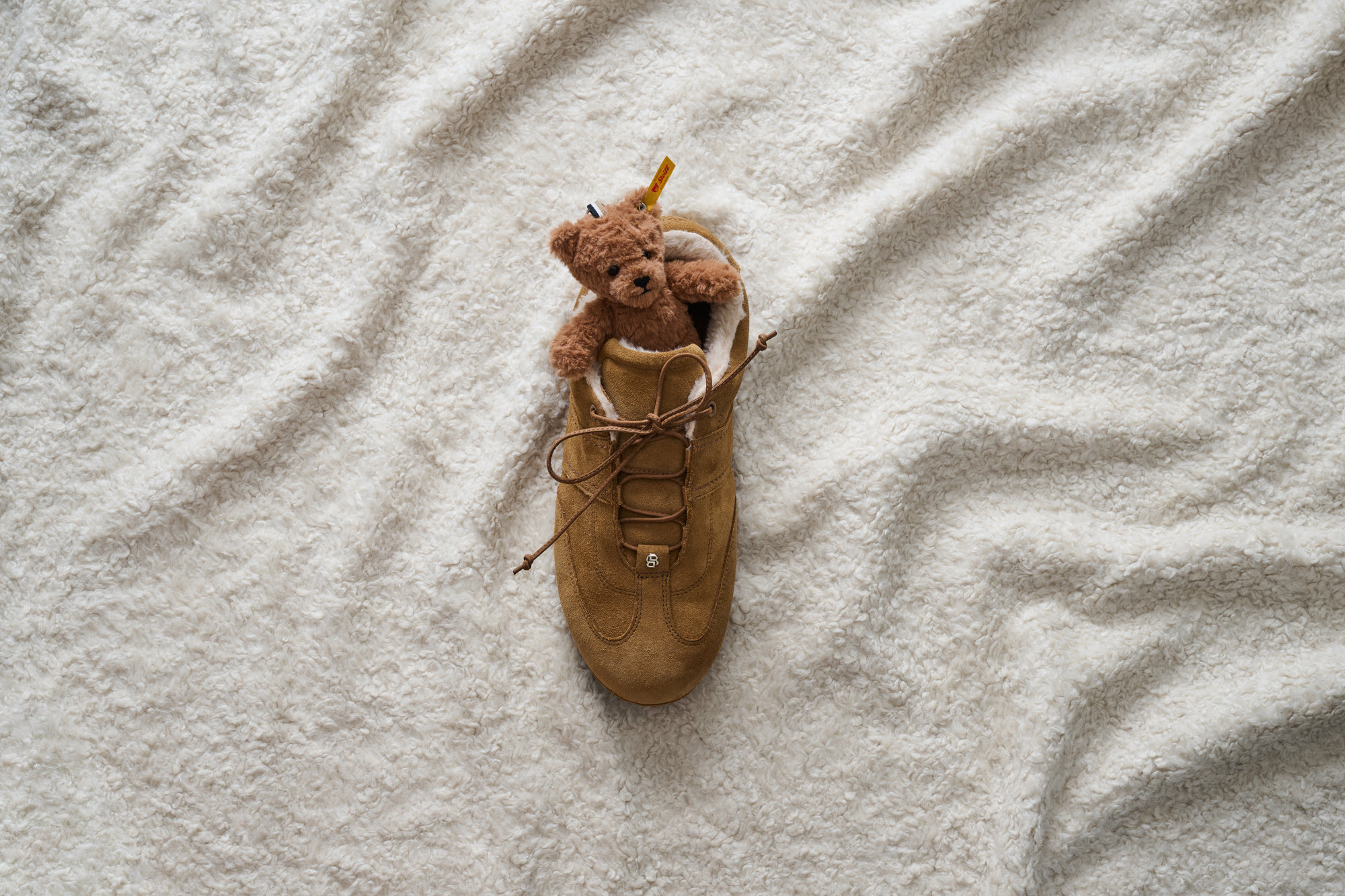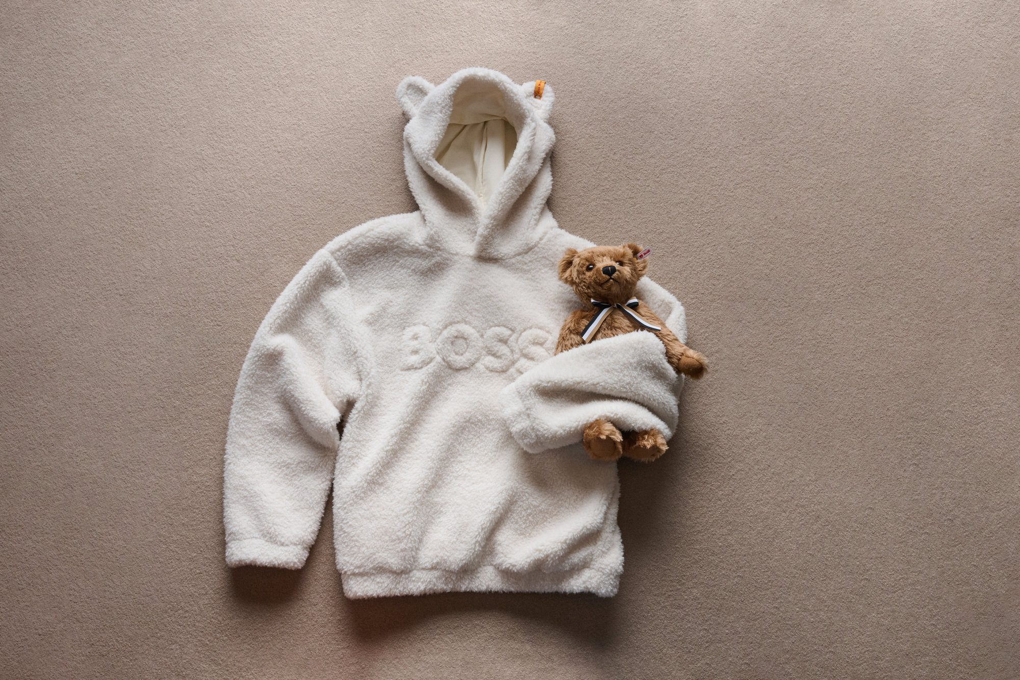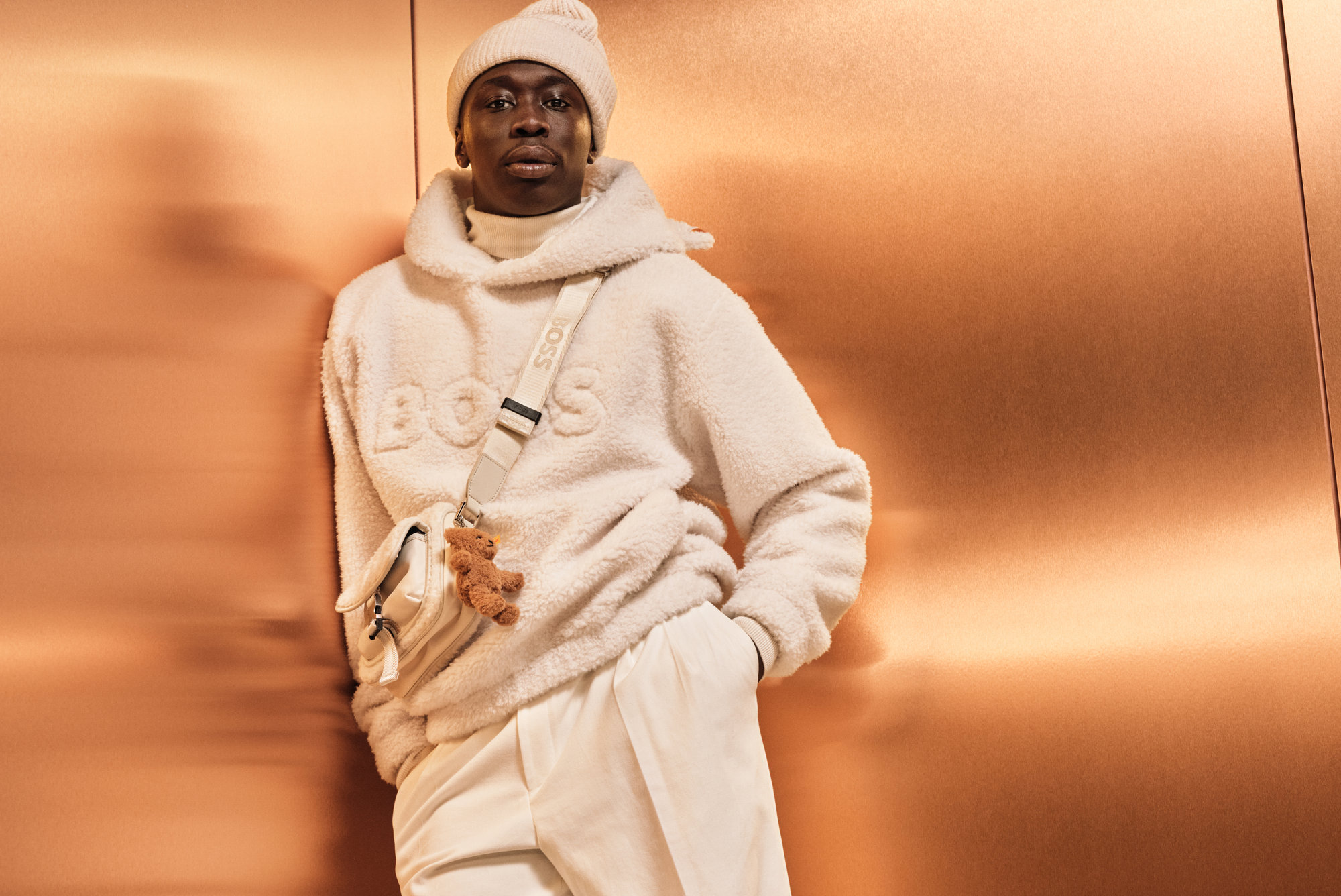 系列以奶油白與焦糖棕為主色調,推出泰迪熊絨毛大衣、外套、連帽運動衫、毛帽與手套等冬季必備單品,也包含 T 恤、毛衣、襯衫等日常款式,並延伸至童裝。BOSS 經典鞋包 Ariell 與 Gary 休閒鞋同樣換上絨料細節,展現更輕柔的奢華氣息。