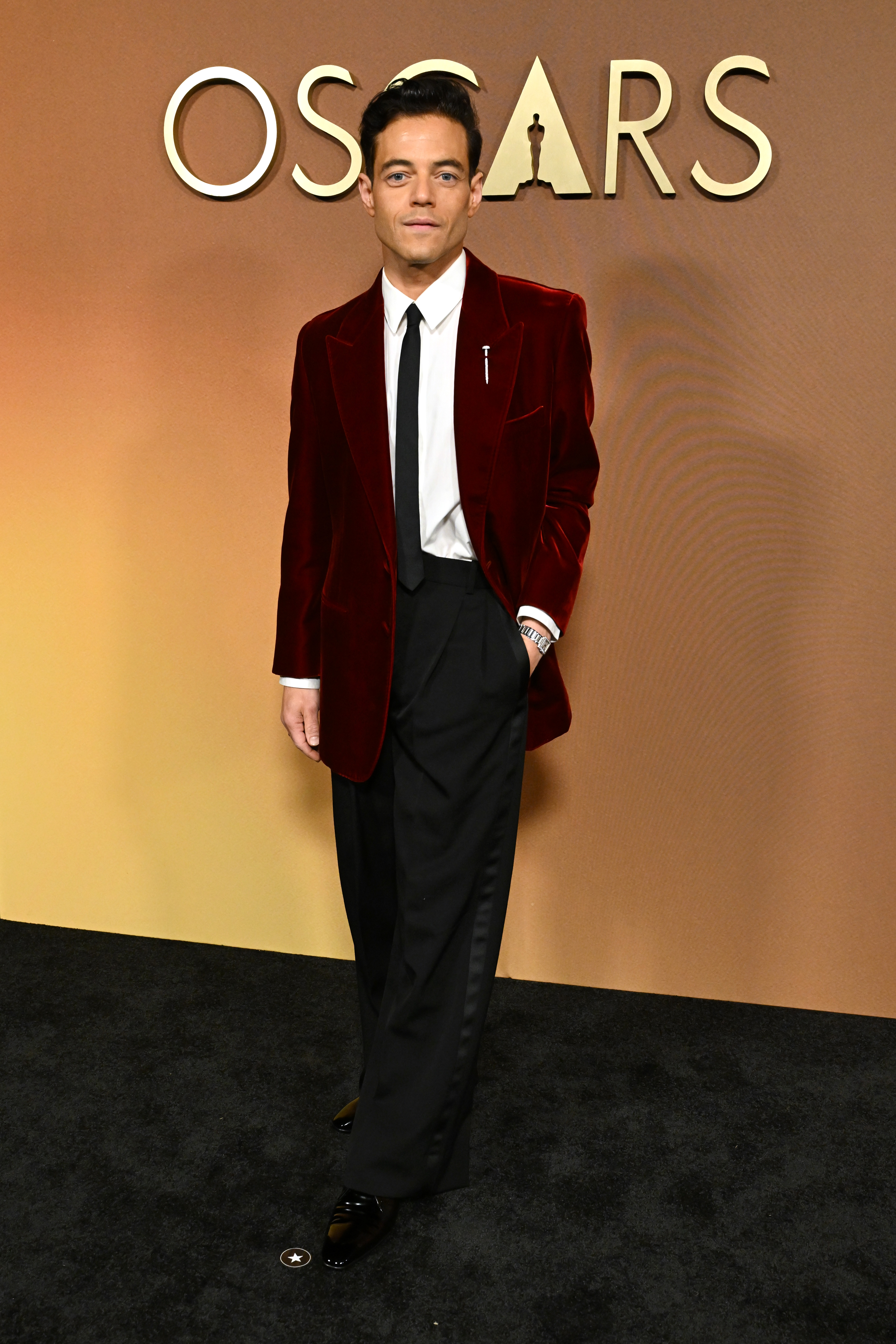 Rami Malek的紅色天鵝絨Saint Laurent西裝非常搶眼,領片上的Cartier胸針是點睛之筆