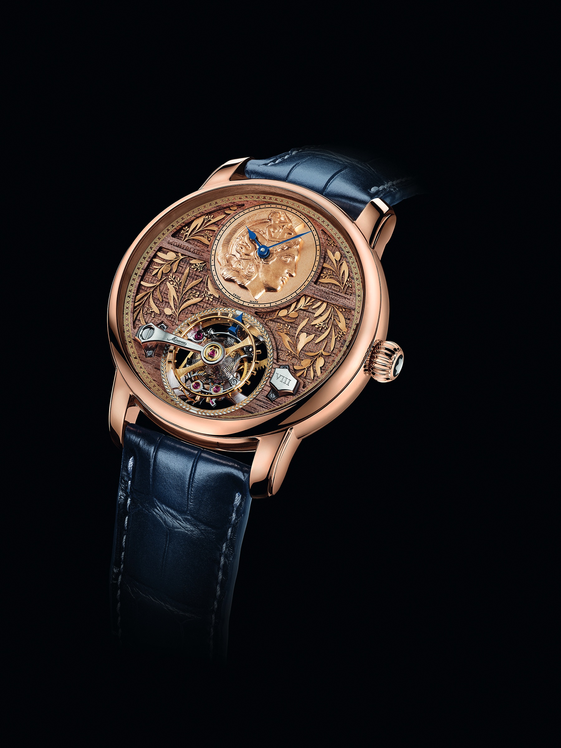 同樣也是藝術品收藏等級的還有萬寶龍的明星傳承系列懸浮外置陀飛輪腕錶,這款限量版的錶盤以核桃木製作,並鑲嵌金質橄欖葉。12點鐘方向的面盤飾有密涅瓦女神的金頭像,是仿照一枚品牌典藏中曾用於錶廠廣告的古錢幣。而懸浮式外置陀飛輪指的是將大型擺輪置於陀飛輪旋轉框外,創造出漂浮的視覺體驗。