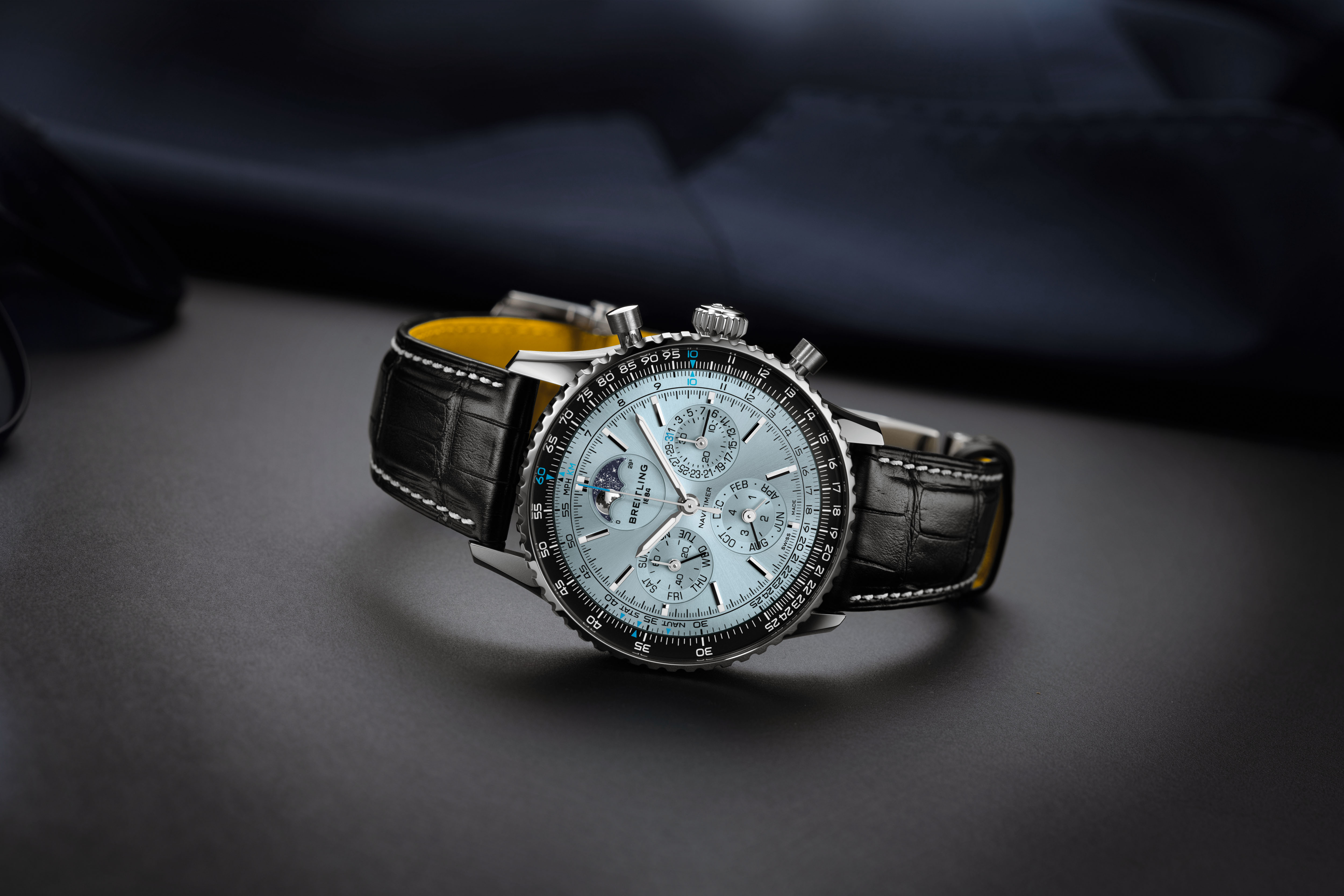 百年靈有著強大的機芯設計功力,但並不致力於大複雜功能的研發。這款Navitimer B19萬年曆計時碼錶其實是在去年作為慶祝品牌140週年而推出的力作,今年換上近期相當熱門的冰藍色錶盤,最令人驚訝的是其96小時的動力儲存,對於這類大複雜功能錶款來說相當難得。