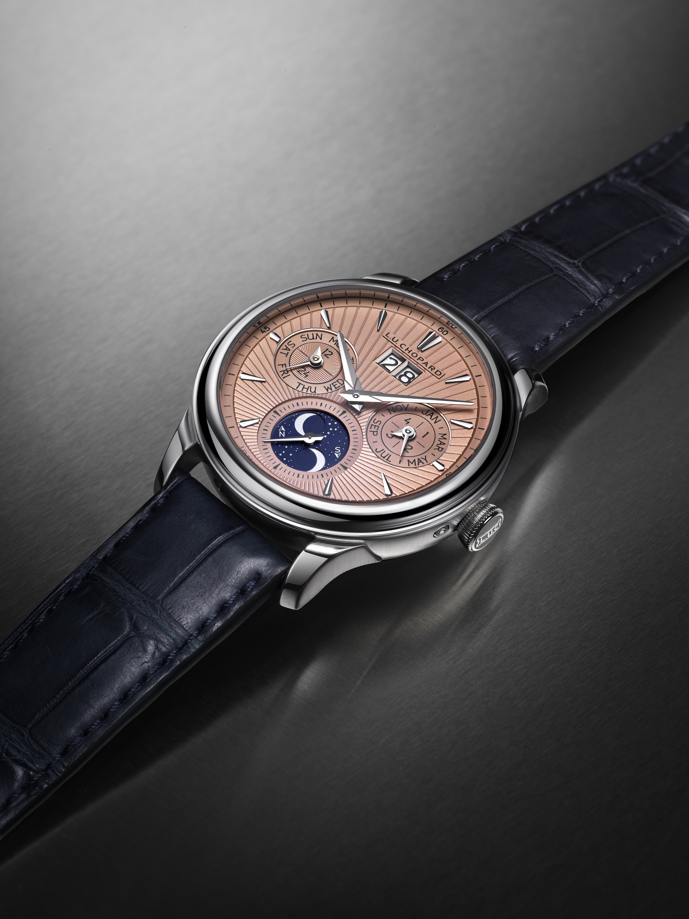 蕭邦這款萬年曆腕錶著眼點在其「軌道式月相」功能,夜空繁星以小秒針為軸心圍繞旋轉,同時呈現北半球的北斗七星和南半球的南十字星天空。12鐘方向的大日期視窗,以及環繞錶盤的同心渦紋裝飾,有著精心設計的美學價值。錶殼以符合倫理道德標準的18K白金製成,人文關懷價值也同樣滿備。