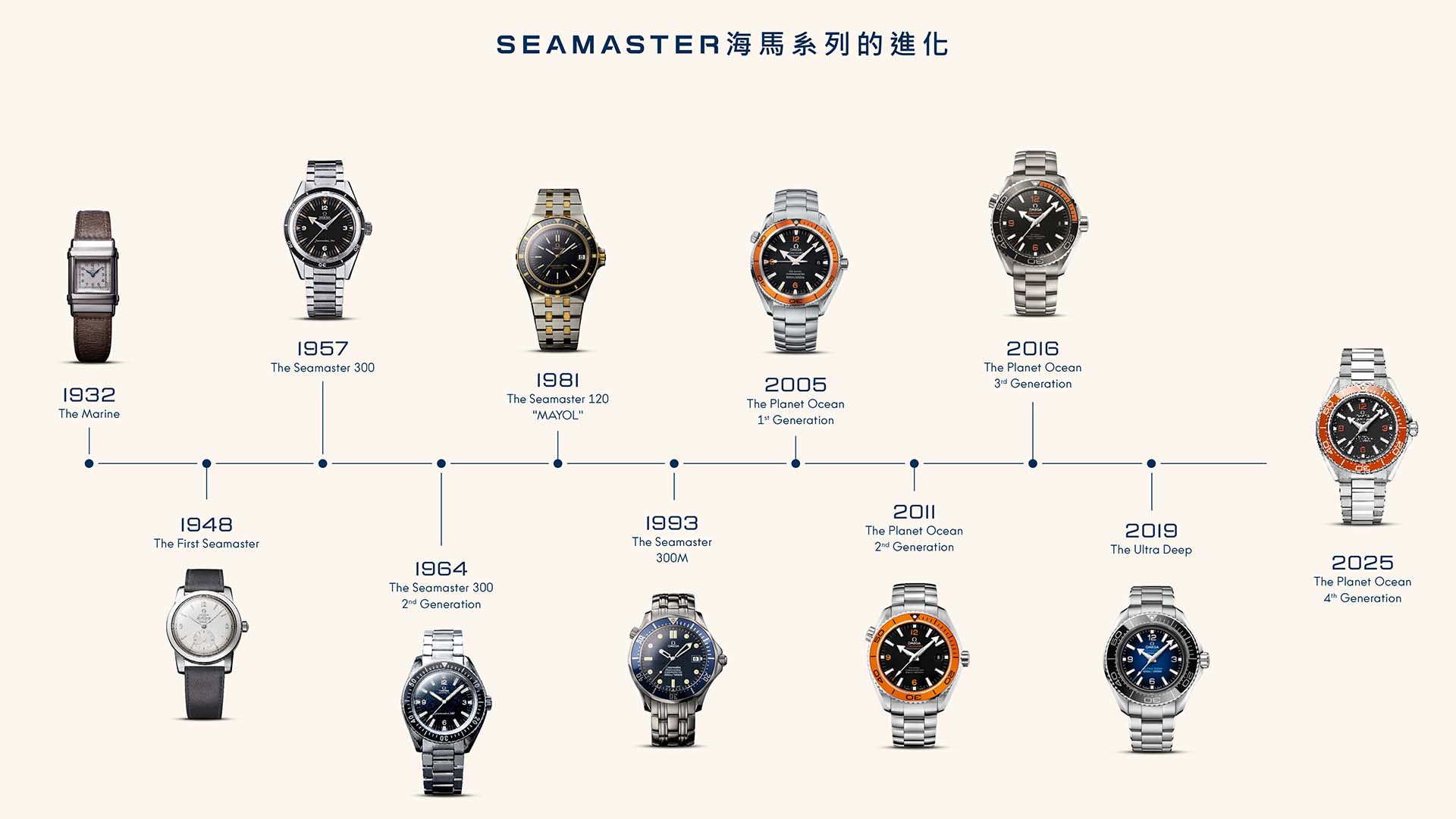 歐米茄的潛水傳承始於1932年推出的Marine,被公認為全球第一款為民用潛水員打造的腕錶。從1950年代的Seamaster 300、1993年的Seamaster Diver 300M,到2005年首款Planet Ocean,每一次創新都進一步奠定品牌「潛水腕錶大師」的聲譽。