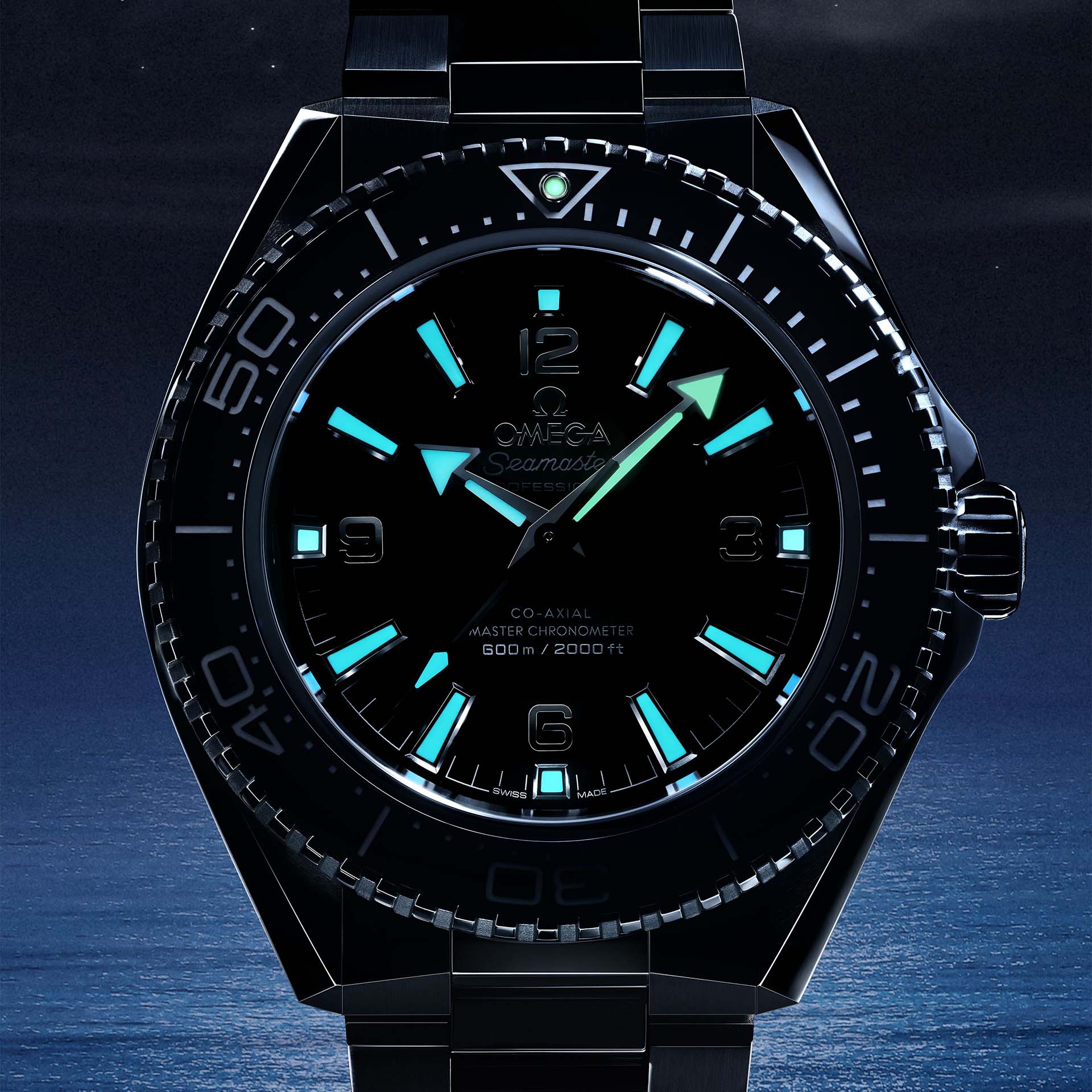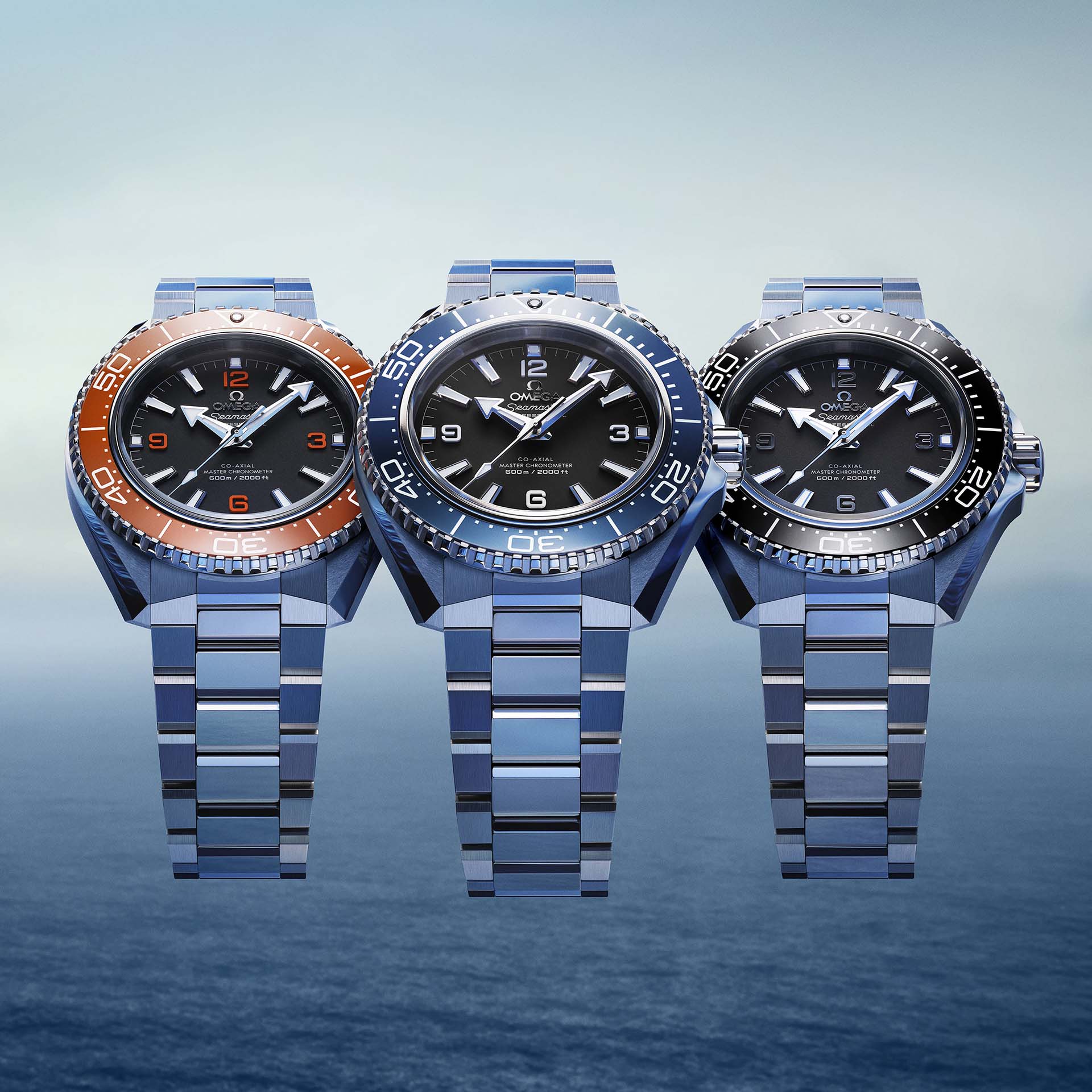 全新系列皆採用啞黑錶盤,保留箭形指針與覆有Super-LumiNova的立體時標,確保水下環境的清晰易讀性。最引人注目的改變是阿拉伯數字時標採用鏤空且更為方正的造型,呼應錶殼與鍊帶的俐落感,同時向第一代Planet Ocean致敬。