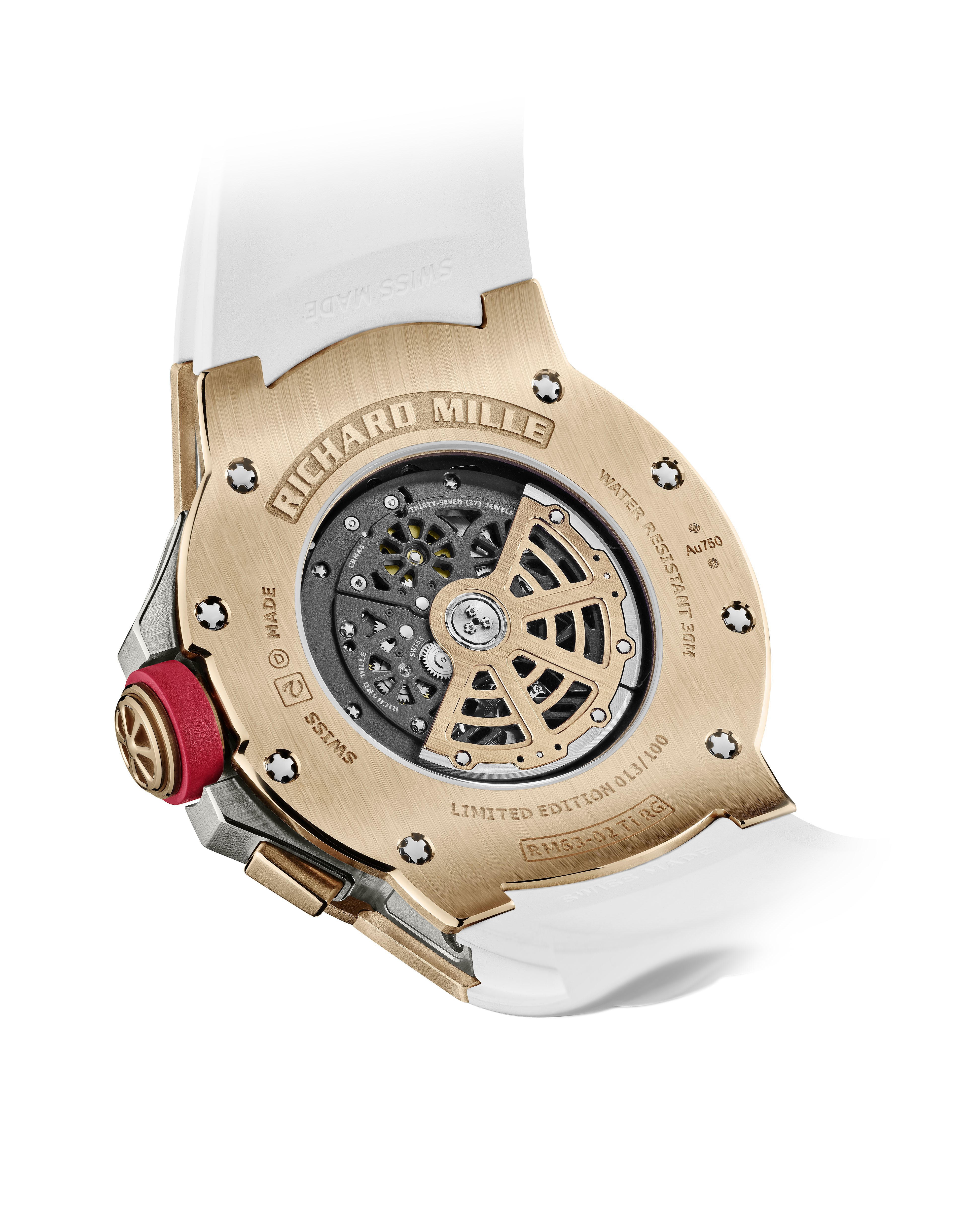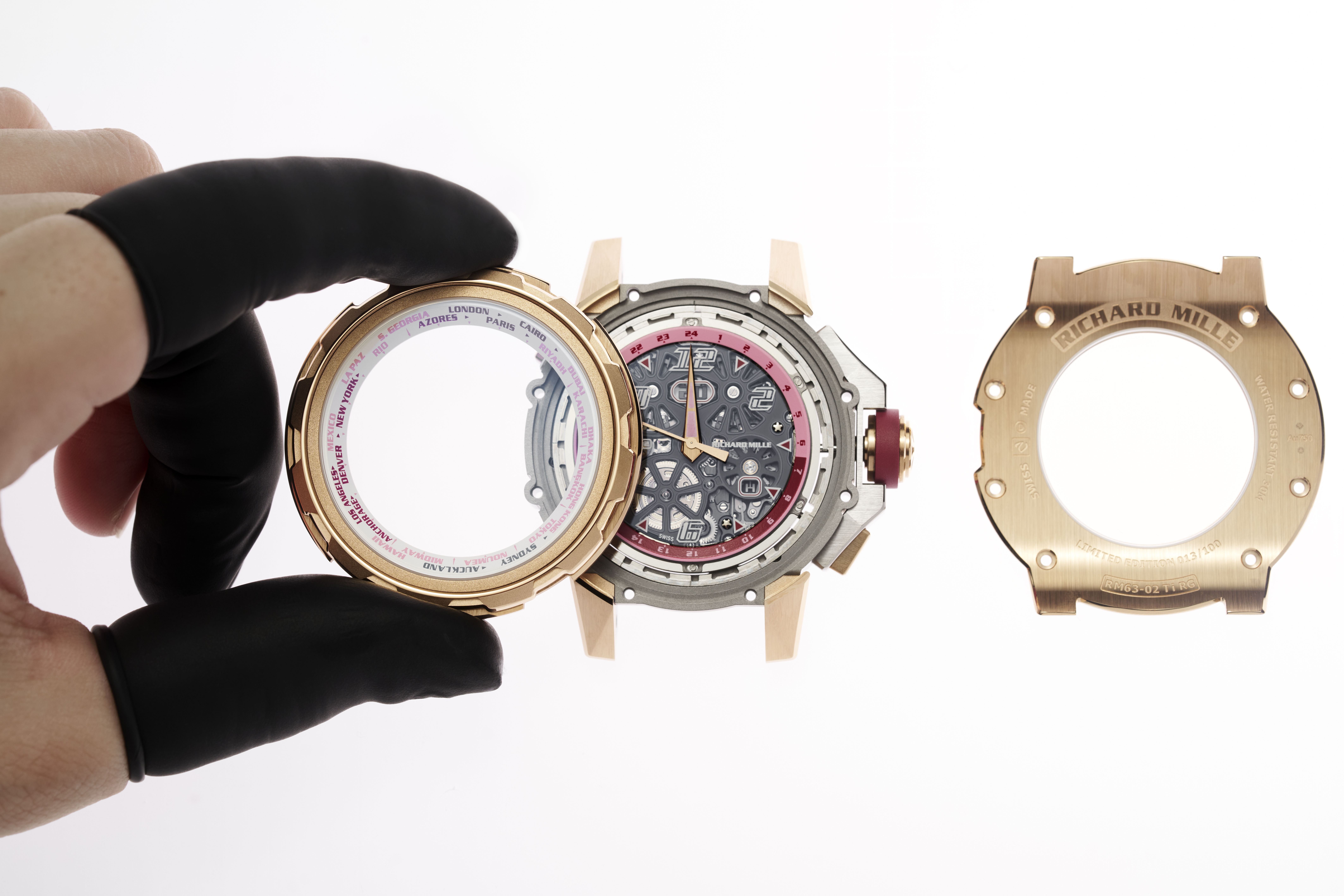 RM 63-02直徑47毫米、厚度13.45毫米的錶殼,由緞面打磨5N紅金經銑削成型,輔以拋光斜角處理,中層錶殼採用五級鈦合金打造,底蓋經多重弧度銑削工藝雕飾。三件式錶殼內含106枚零件,其中12枚零件專為驅動世界時區錶圈而生,另有86枚CRMA4機芯中的零件共同實現切換時區的精密機制。為確保此精密機制持久運行,所有元件都需達到極致的精準度。歷經超過5,000次完整旋轉測試,並在每1,000次旋轉後檢測密封性能,在講究精準計時外,更保證30米的防水性能。