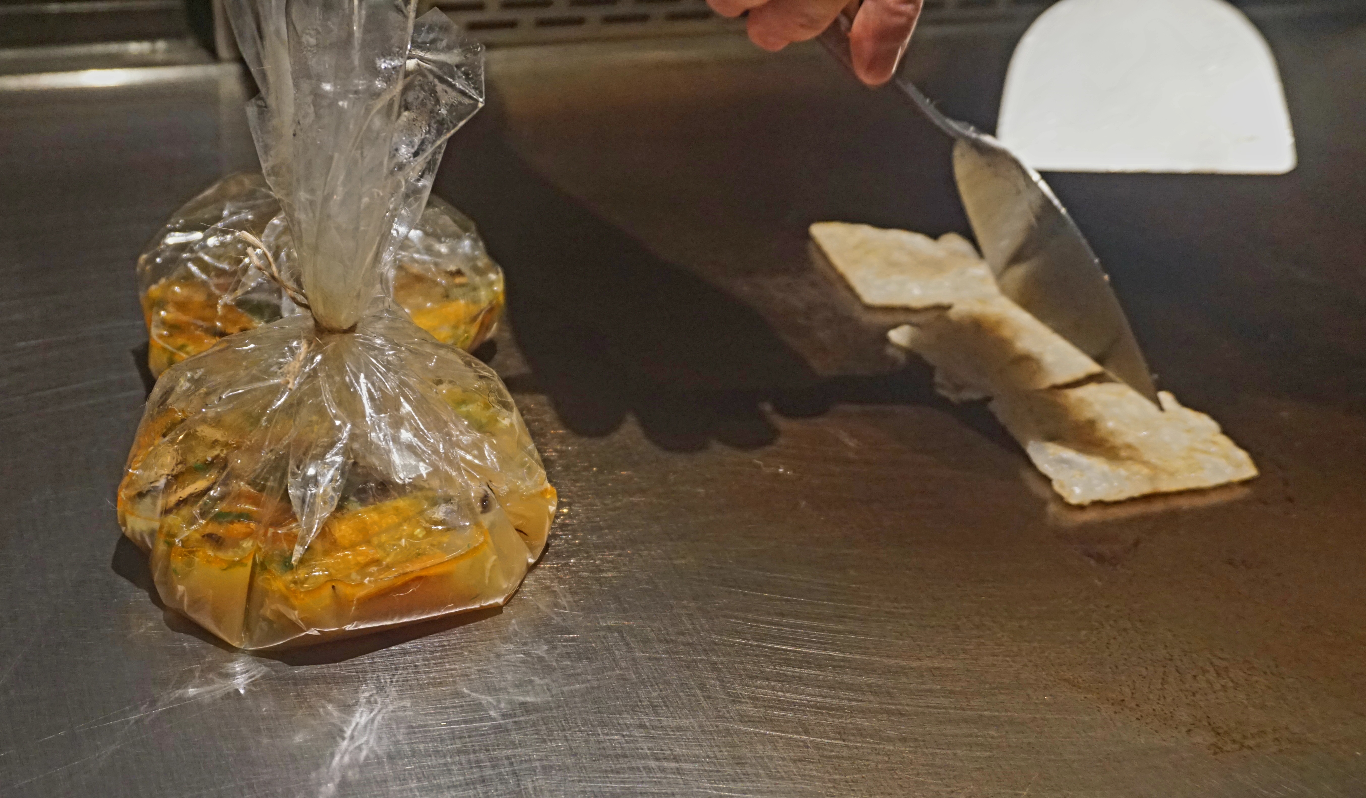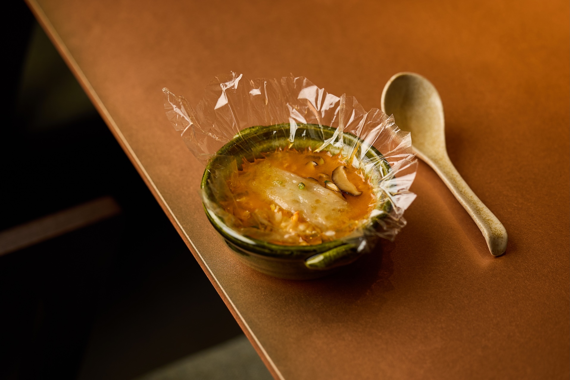 最後將玻璃紙剪開,並添上以鐵板煎製在來米粉漿的鼎邊銼皮,口感焦香Q彈,浸泡在湯汁中更將湯中濃郁鮮美的精華吸附其上,每一口的咀嚼皆能感受到龍蝦的濃鮮風韻直擊味蕾,柔韌彈牙的銼皮讓鮮香之中透出澱粉煎烤後的甘香,滋味極其豐美。