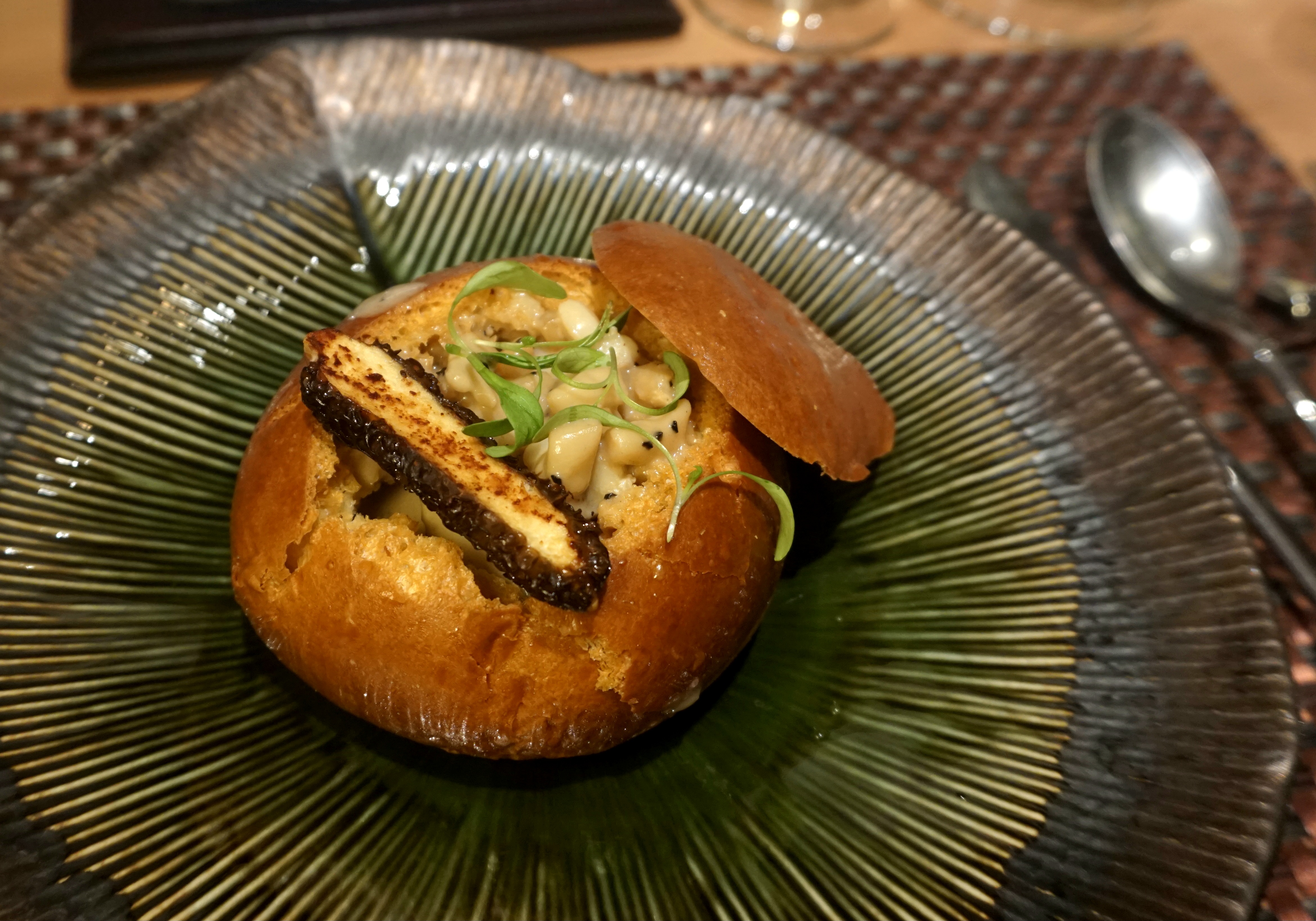 在基礎的9道式套餐中,Will端上參與《星廚之戰》的代表料理「鮑魚棺材板.羊肝菌.松露醬汁」,是將台灣經典小吃轉化為精緻料理的具體之作。將鮑魚與軟絲透過鐵板煎至軟中帶彈,搭配蘑菇、洋蔥等食材,並以大骨湯為基底的羊肝菌菇湯賦味,最後再裝盛於法式布里歐麵包中。布里歐麵包的奶油香氣與柔軟質地與濃香的松露奶醬完美交織,羊肝菌包裹著雞肉慕斯香煎過後形成略帶焦香的深邃風韻,襯托出鮑魚的彈牙鮮美之感,從濃至鮮的風味層次讓整體口感清爽而不覺負擔。