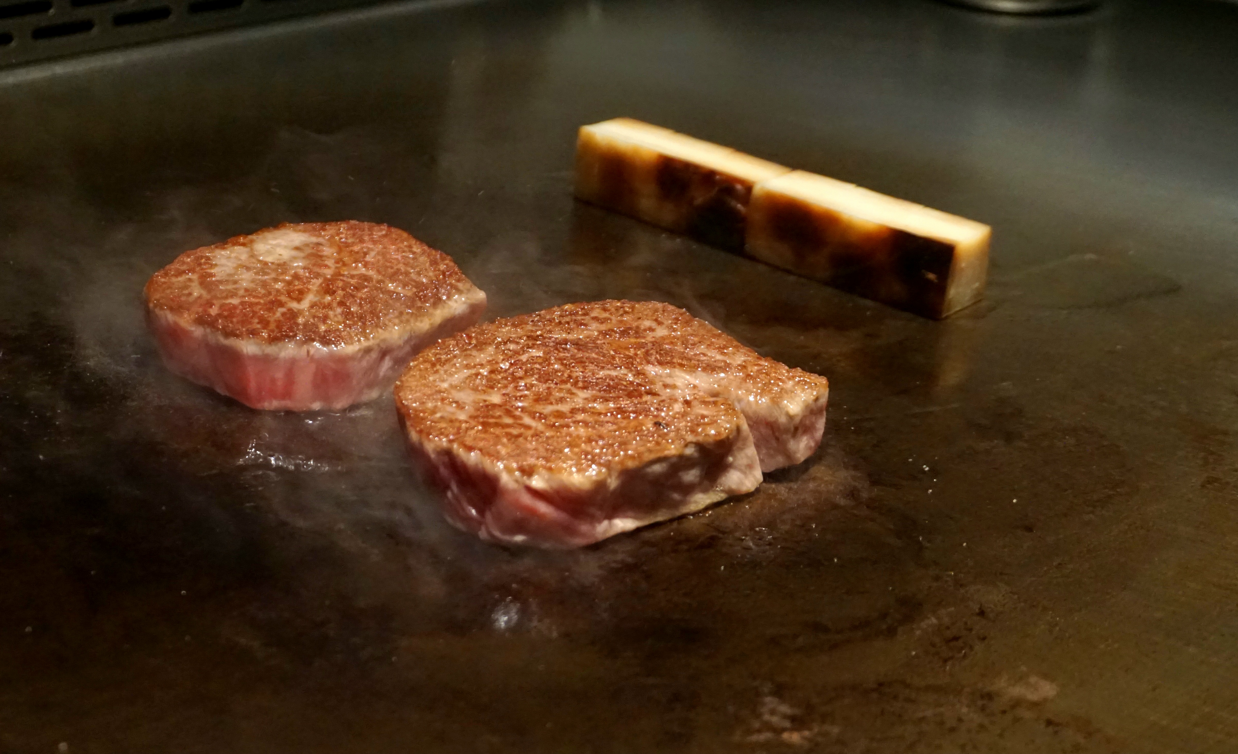 和牛與千層馬鈴薯於鐵板上煎至焦香誘人。